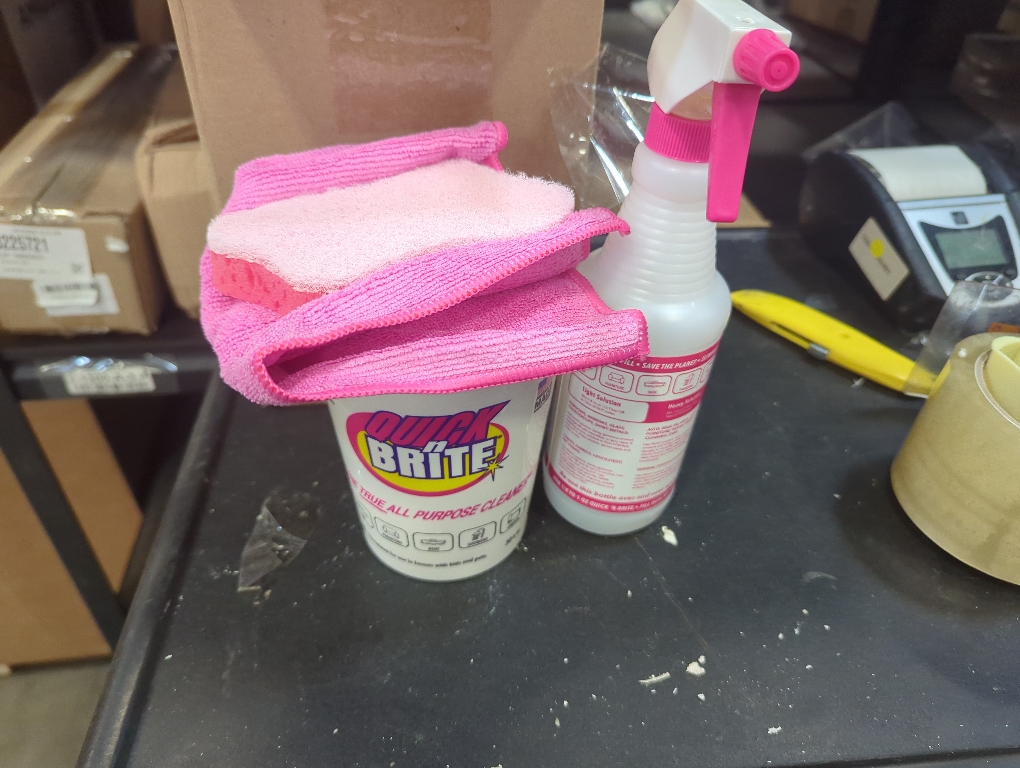New Open box for inspection Set of 4 Size 32oz cleaner , squirt bottle sponge and rag ULTIMATE ALL-PURPOSE CLEANER – Quick ’n Brite replaces multiple household cleaners, tackling tough stains, grease, and grime on carpets, ovens, BBQs, kitchens, shoes, and more. SAFE & ENVIRONMENTALLY FRIENDLY – Free from harmful chemicals, Quick ’n Brite is PET-SAFE, KID-SAFE, and doesn’t contain phosphates, scratch-causing abrasives, or harsh irritants. TOUGH ON STAINS, GENTLE ON SURFACES – Made from natural ingredients, our cleaner works fast and effectively without scratching or damaging surfaces. EASY TO USE – Follow simple instructions to clean nearly anything: stovetops, showers, shoes, bathtubs, countertops, and more. TRUSTED FOR OVER 70 YEARS – Proudly made in the USA by a family-owned company committed to safe, effective, and biodegradable cleaning solutions.