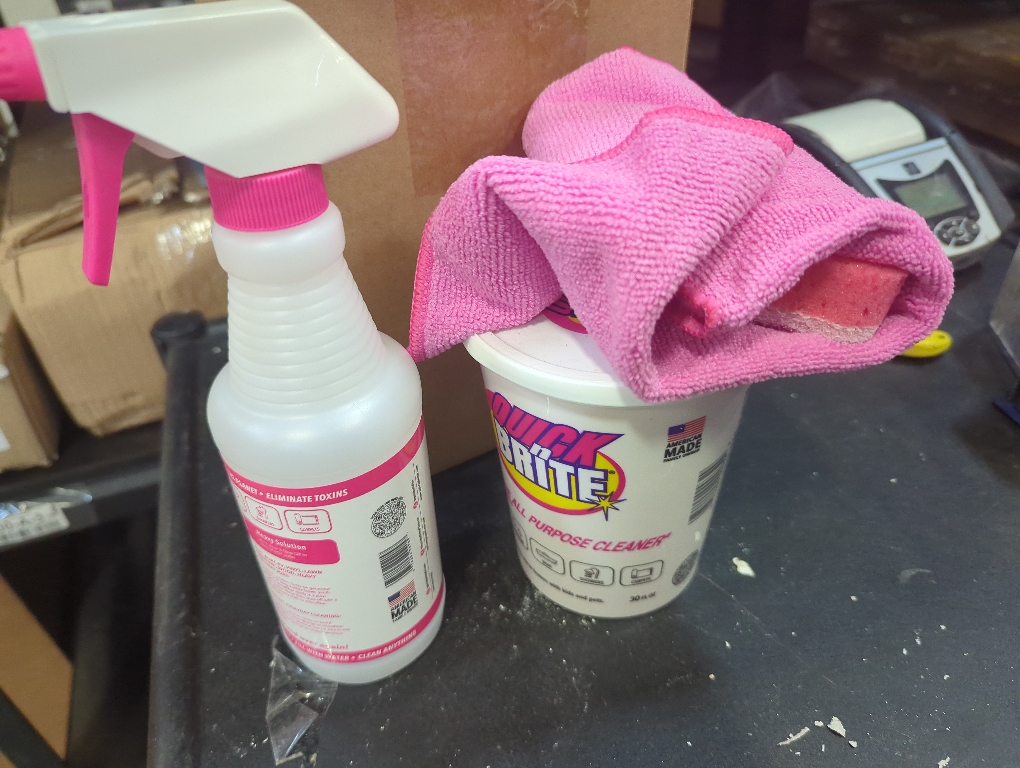 New Open box for inspection Set of 4 Size 32oz cleaner , squirt bottle sponge and rag ULTIMATE ALL-PURPOSE CLEANER – Quick ’n Brite replaces multiple household cleaners, tackling tough stains, grease, and grime on carpets, ovens, BBQs, kitchens, shoes, and more. SAFE & ENVIRONMENTALLY FRIENDLY – Free from harmful chemicals, Quick ’n Brite is PET-SAFE, KID-SAFE, and doesn’t contain phosphates, scratch-causing abrasives, or harsh irritants. TOUGH ON STAINS, GENTLE ON SURFACES – Made from natural ingredients, our cleaner works fast and effectively without scratching or damaging surfaces. EASY TO USE – Follow simple instructions to clean nearly anything: stovetops, showers, shoes, bathtubs, countertops, and more. TRUSTED FOR OVER 70 YEARS – Proudly made in the USA by a family-owned company committed to safe, effective, and biodegradable cleaning solutions.