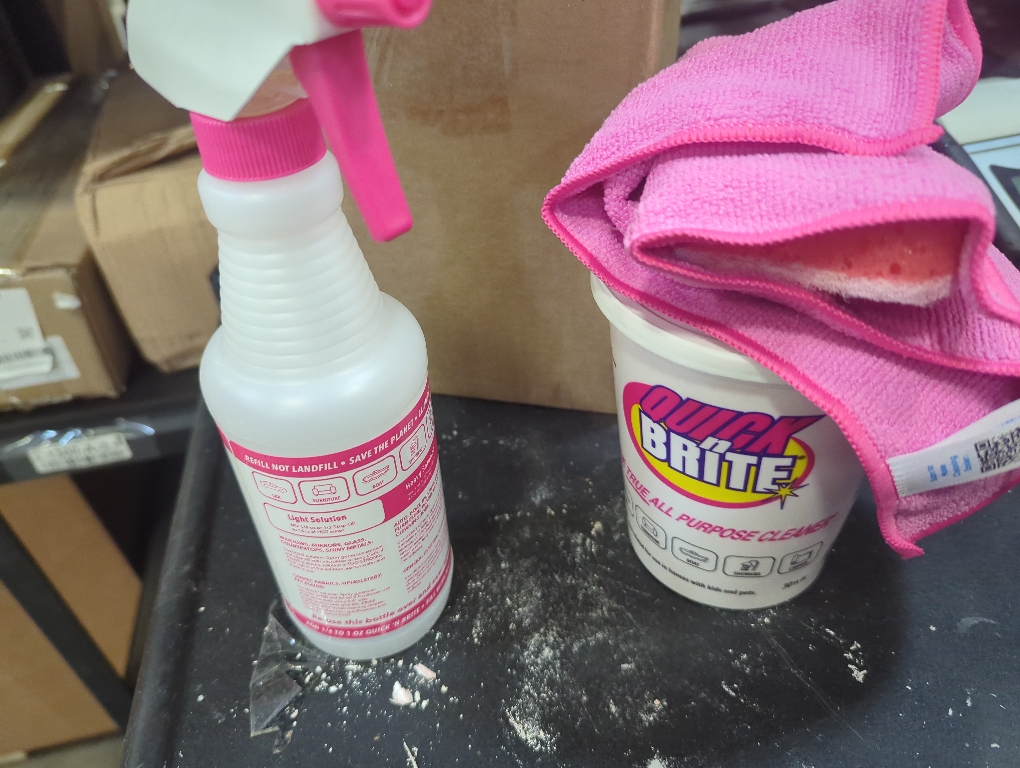 New Open box for inspection Set of 4 Size 32oz cleaner , squirt bottle sponge and rag ULTIMATE ALL-PURPOSE CLEANER – Quick ’n Brite replaces multiple household cleaners, tackling tough stains, grease, and grime on carpets, ovens, BBQs, kitchens, shoes, and more. SAFE & ENVIRONMENTALLY FRIENDLY – Free from harmful chemicals, Quick ’n Brite is PET-SAFE, KID-SAFE, and doesn’t contain phosphates, scratch-causing abrasives, or harsh irritants. TOUGH ON STAINS, GENTLE ON SURFACES – Made from natural ingredients, our cleaner works fast and effectively without scratching or damaging surfaces. EASY TO USE – Follow simple instructions to clean nearly anything: stovetops, showers, shoes, bathtubs, countertops, and more. TRUSTED FOR OVER 70 YEARS – Proudly made in the USA by a family-owned company committed to safe, effective, and biodegradable cleaning solutions.