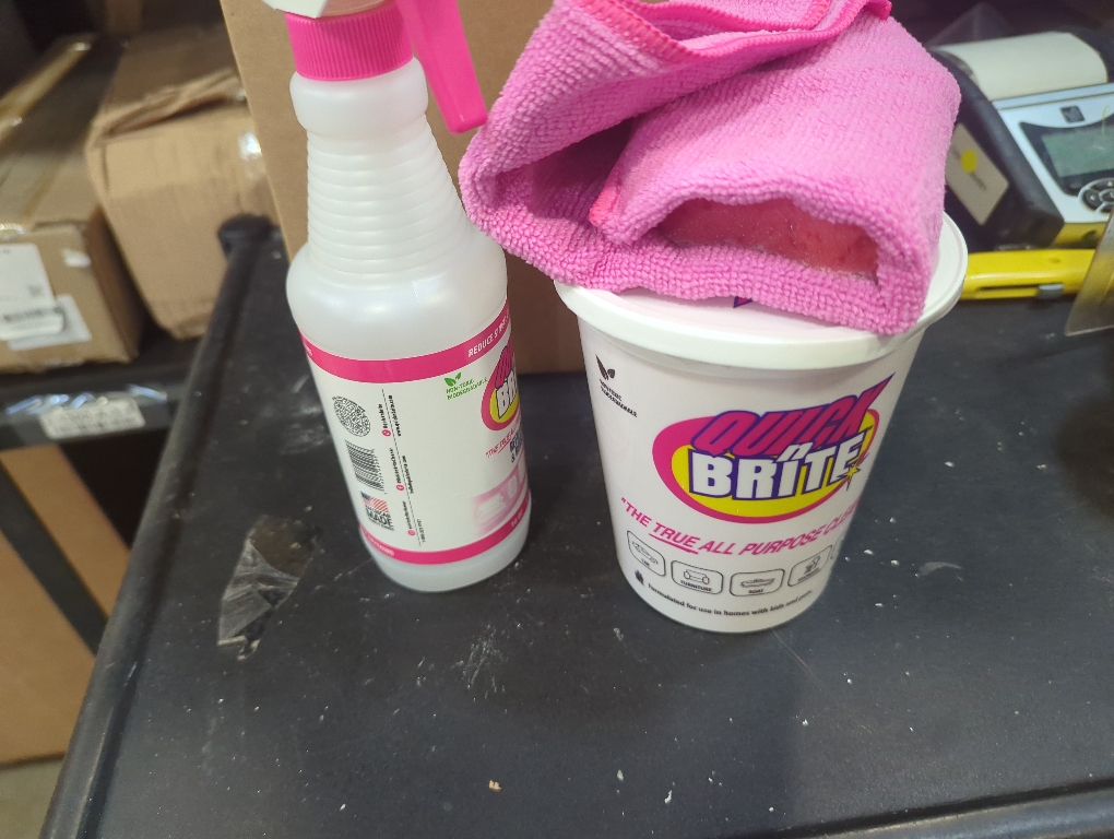New Open box for inspection Set of 4 Size 32oz cleaner , squirt bottle sponge and rag ULTIMATE ALL-PURPOSE CLEANER – Quick ’n Brite replaces multiple household cleaners, tackling tough stains, grease, and grime on carpets, ovens, BBQs, kitchens, shoes, and more. SAFE & ENVIRONMENTALLY FRIENDLY – Free from harmful chemicals, Quick ’n Brite is PET-SAFE, KID-SAFE, and doesn’t contain phosphates, scratch-causing abrasives, or harsh irritants. TOUGH ON STAINS, GENTLE ON SURFACES – Made from natural ingredients, our cleaner works fast and effectively without scratching or damaging surfaces. EASY TO USE – Follow simple instructions to clean nearly anything: stovetops, showers, shoes, bathtubs, countertops, and more. TRUSTED FOR OVER 70 YEARS – Proudly made in the USA by a family-owned company committed to safe, effective, and biodegradable cleaning solutions.