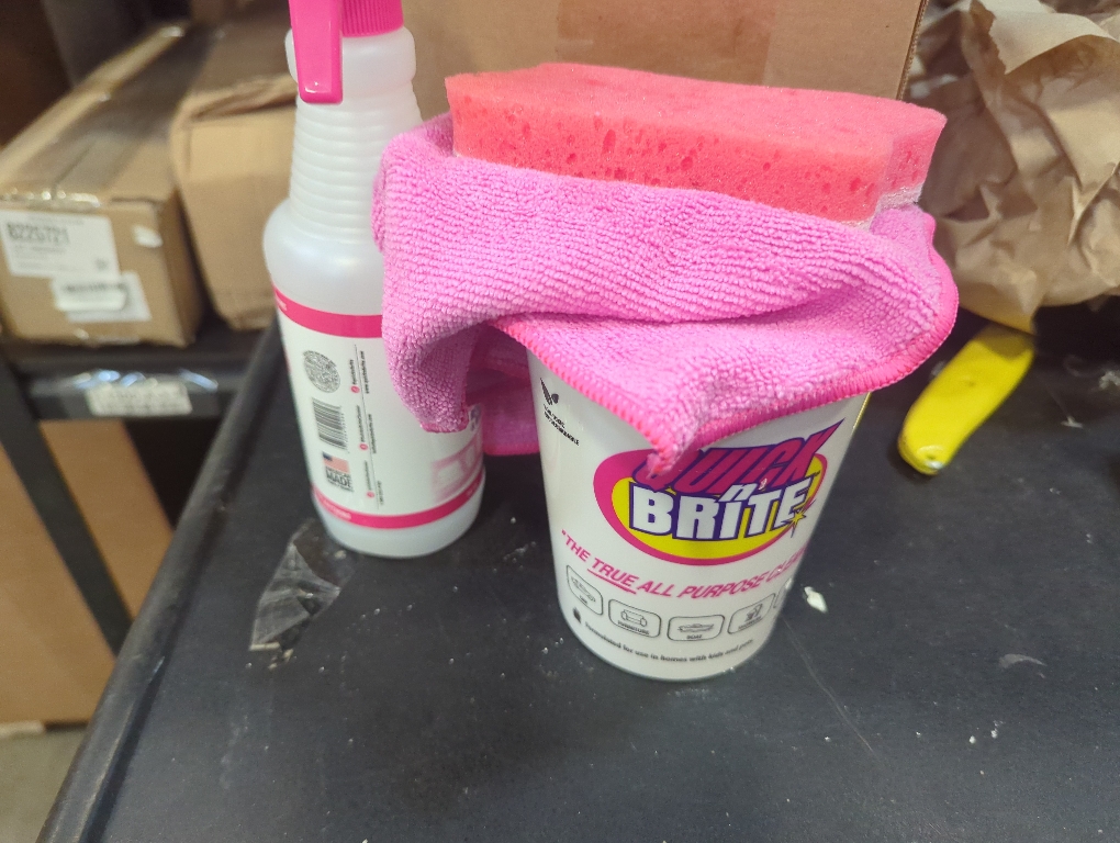 New Open box for inspection Set of 4 Size 32oz cleaner , squirt bottle sponge and rag ULTIMATE ALL-PURPOSE CLEANER – Quick ’n Brite replaces multiple household cleaners, tackling tough stains, grease, and grime on carpets, ovens, BBQs, kitchens, shoes, and more. SAFE & ENVIRONMENTALLY FRIENDLY – Free from harmful chemicals, Quick ’n Brite is PET-SAFE, KID-SAFE, and doesn’t contain phosphates, scratch-causing abrasives, or harsh irritants. TOUGH ON STAINS, GENTLE ON SURFACES – Made from natural ingredients, our cleaner works fast and effectively without scratching or damaging surfaces. EASY TO USE – Follow simple instructions to clean nearly anything: stovetops, showers, shoes, bathtubs, countertops, and more. TRUSTED FOR OVER 70 YEARS – Proudly made in the USA by a family-owned company committed to safe, effective, and biodegradable cleaning solutions.
