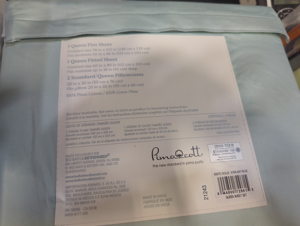 Set of 4 Size Queen Color Blue Queen flat sheet 1 queen fitted sheet 2 pillow cases Why we love this..Offered in beautiful neutral tones that complements all spaces Made with the purest quality Pima Cotton for exceptionally soft and long lasting sheets.