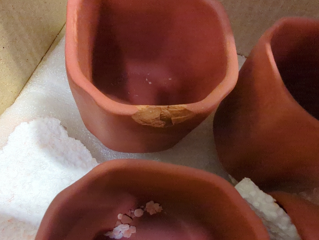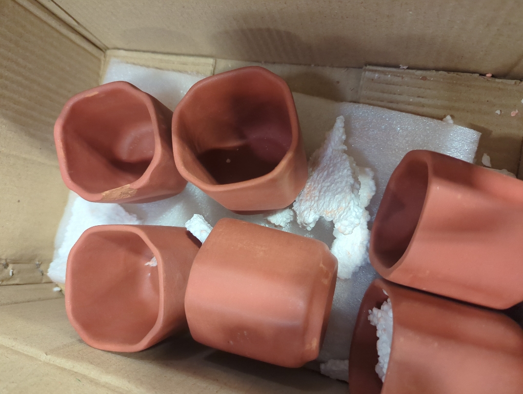 One cup is chipped Set of 6 KLEO presents - Set of 6 Handmade Water Glasses in Earthen Clay. PLEASE NOTE: This is a fragile product made of clay and may be broken during transit. Package Contents: 6 Glasses Set; Material: Clay; Color: Brown; Size of 1 Glass: 4" [H] x 3" [D]; Total Weight of 6 Glasses: 850 gms approx; Total Dimensions of Set: 12" x 10" x 7" inches. These glasses are handmade and it makes the taste of tea, coffee and juices better. These glasses are not meant for Beer or Shake considering the size. Easy to clean. No need to use soap / detergent to wash the clay ware. Soaking in warm water and scrub with non-abrasive scrubber is enough to clean the utensil. PLEASE NOTE: THESE ARE REUSABLE AFTER WASH. USE LIKE ANY OTHER KITCHENWARE / TABLEWARE / SERVEWARE. Our products are unique and beautiful crafts of India that are suitable for Gifts as well as Home Decor.