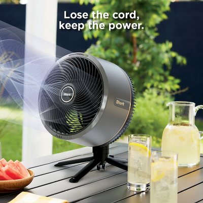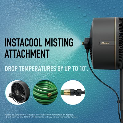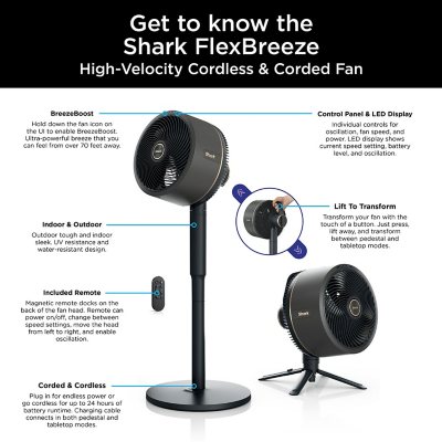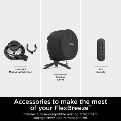 Corded to Cordless Versatility. Up to 24-Hour Runtime. Outdoor Tough, Indoor Sleek. Includes Misting Attachment & Storage Cover. Variable Speeds, Oscillation, and More. Meet the ultra-powerful Shark FlexBreeze Fan with InstaCool misting attachment. Cordless & corded, outdoor & indoor, transforms from pedestal & tabletop with 70 ft range and up to 24-hour runtime. The InstaCool misting attachment easily connects to your hose and rapidly reduces temperatures to feel up to 10 degrees cooler. Incredibly quiet, even at high speed. Rain and UV resistance for outdoor use. Outdoor Tough, Indoor Sleek. Outdoor tough—rain-resistant and durable. Take it to sporting events, cookouts, the park, or the beach, and use it outside with no stress. Indoor sleek—a stylish addition to your home. Enhance your space, indoors or out. InstaCool Misting Attachment. Enjoy immediate, on-demand cooling mist— easily connects to your hose and rapidly reduces temperatures to feel up to 10 degrees cooler*. *Based on temperature reduction in controlled environment at 84 degrees, 9 feet from fan and 50% RH. Performance will vary with environmental factors.s. Corded to Cordless. Plug in this ultra-powerful fan for endless power, or for more freedom, go cordless. Up to 24-Hours of Cordless Runtime. At its lowest speed, Flexbreeze can last all day - or experience a powerful 6 hours at average setting. Run out of battery? Just plug it in and keep the power going while recharging. Transforms to Tabletop. Switch from pedestal to tabletop mode in seconds with the press of a button so you can grab it and go—truly take your cool-down anywhere. Bring the Boost. In BreezeBoost™ mode, you can feel the breeze from over 70 feet away—fend off heat outside, or bring amazing air circulation inside. Variable Speeds, Oscillation, and More. 5 fan speeds, 180 degrees of side-to-side oscillation, 55-degree up-and-down tilt. Lightweight design at only 13 lbs., with a misting attachment and even a remote that you can store on the fan. Durable. UV resistance and a water-resistant design mean it's safe to use outside, rain or shine. Ultra-Quiet. Incredibly quiet even at the highest speed, perfect for working from home or sleeping. What's Included. FlexBreeze Fan Head, Pedestal Pole, Pedestal Base, Charging Cable, Remote (Lithium-Ion Button Battery Included), Misting Attacment, Storage Cover.