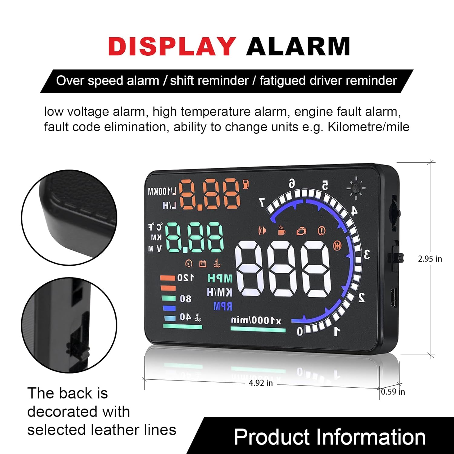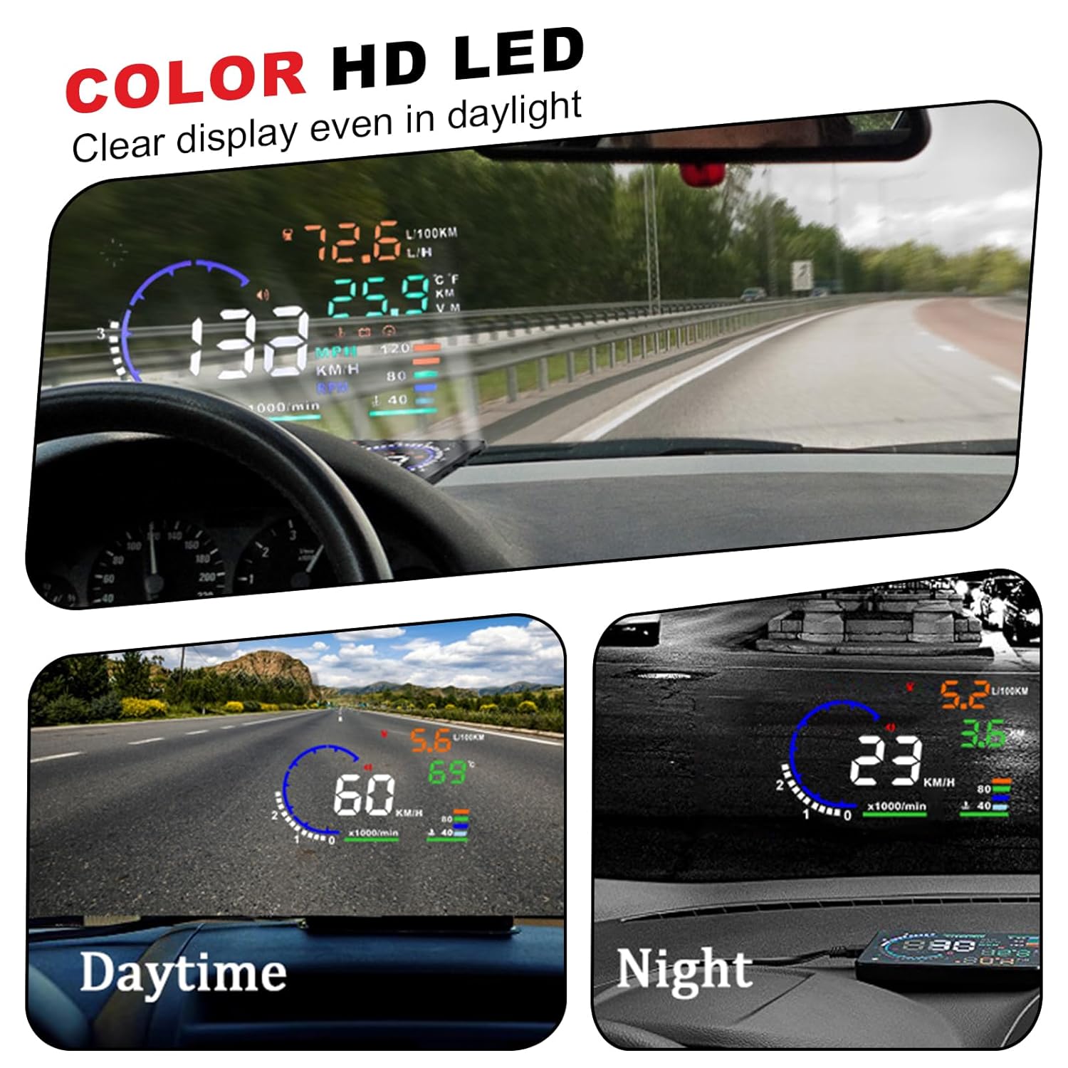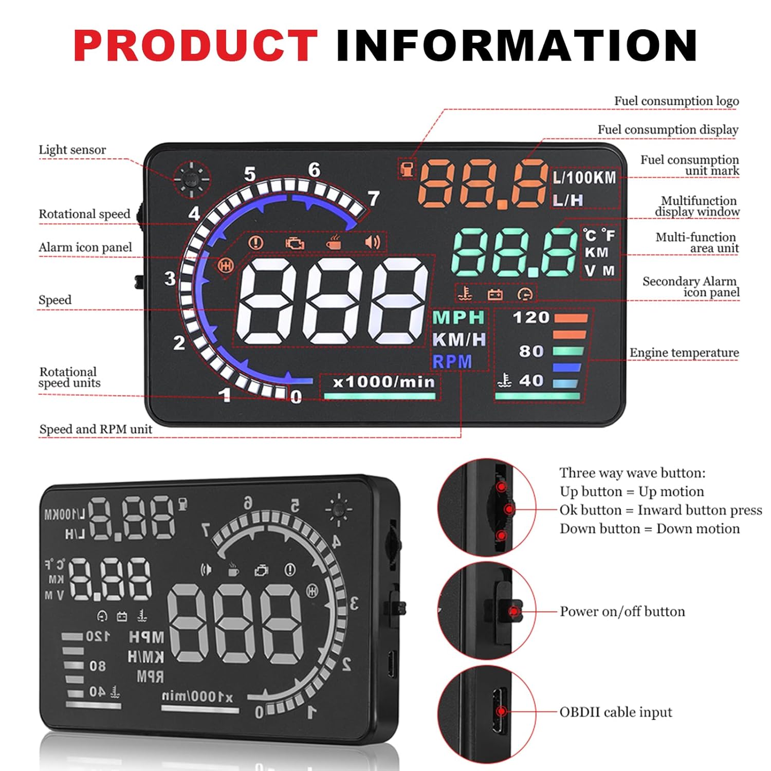 2. HUD Functions: OBD System:(available for cars with OBD2 interface) vehicle speed, engine RPM, water temperature, driving distance, battery voltage, KM/MPH switch, speed alarm, water temperature alarm, voltage alarm, etc. All system hud can automatically adjust the brightness according to the environment. Easy operation.