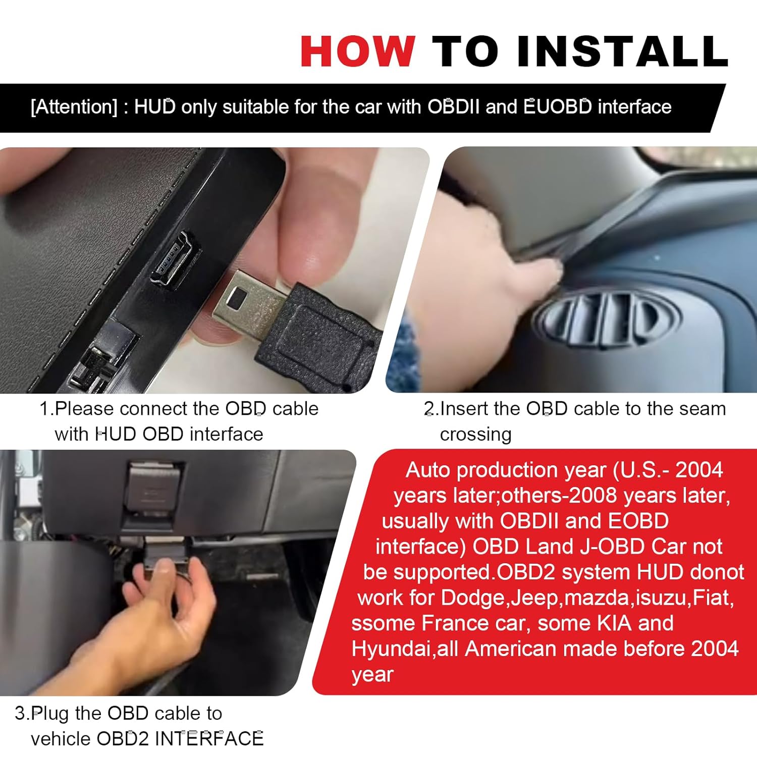 3. HUD Compatibility: OBD2 is only compatible with vehicles made after 2007. Please make sure your car with OBD2 and EOBD. Understand your model brand, when buying HUD need to choose the OBD II (or EU OBD) standard model to use normally, open and look for the sticker under the hood, if there is OBDII CERTIFIED words can be installed, check that there is no car diagnostic seat under the steering wheel (most domestic cars after 2007 are assembled).