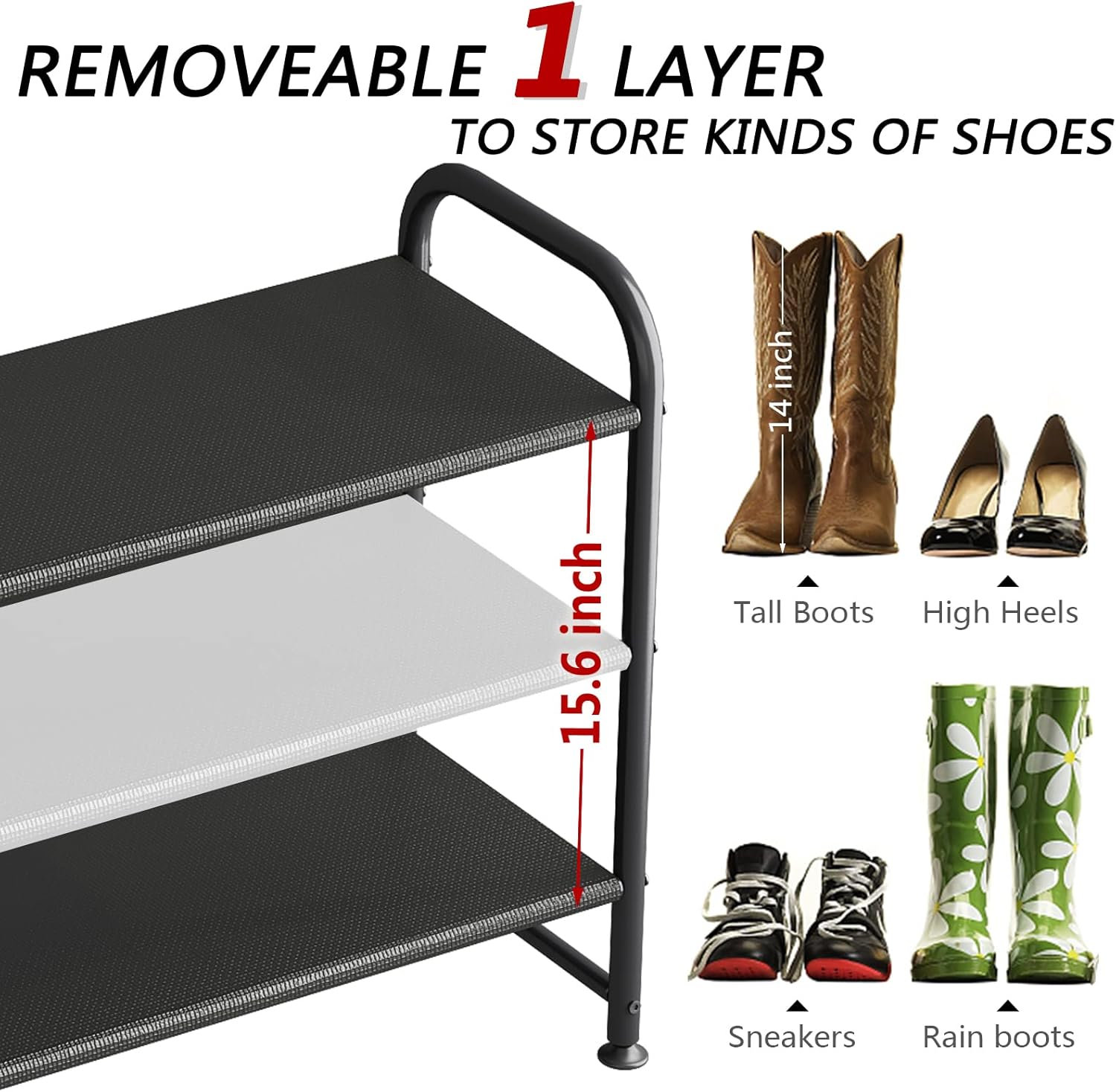 【Multifunctional Shoe Cabinet Organizer】 : This 3-tier shoe rack is designed with shelves of same heights, and removing a row to change 3 tier to 2 tier to fit different kind of shoes, even long rain boots,high heel.It isthe ideal storage solution suitable for any narrow or small space for hallways, closets, dorms,garages, etc.