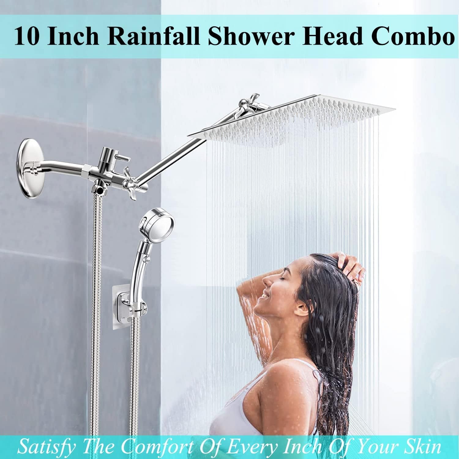 AMAZING SHOWER HEAD COMBO: It comes 10 inch square shower head, 3 spray settings handheld shower, 78 inch stainless steel hose, three-way diverter, sticky shower bracket, Teflon tape, gasket, installation Manual.