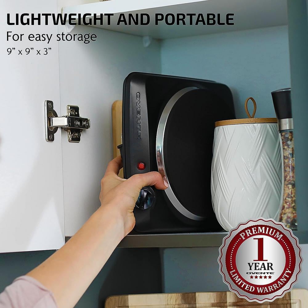 Experience instant and faster cooking time with the OVENTE Electric Single Burner. This portable hotplate offers reliable heating and takes up minimal space. A powerful home appliance built with 1000-wattage that can boil a full pot of stew real fast and heats up any type of pan or cookware easily. Plus it keeps the heat constant according to your desired temperature. Cleaning the nonstick cast iron plate is easy, simply wipe it with a clean, damp cloth. Perfect when you need an extra heat source for holiday cooking and entertaining guests for any house party or occasion. Works great as a gift for students and young adults living on their own, people with small spaces or caravans and you can take it with you when you travel for outings, camping trips or boat rides. Great for everyday use, convenient and easy to operate.. Appliance Type: Hot Plate. Color/Finish: Black. Color/Finish Family: Black. Commercial Use: Residential. Features: Adjustable Thermostat,Power On Light Indicator,Temperature Controls. Housing Material: Stainless steel. Includes: No Additional Items. Maximum Heating Surface Diamter (in.): 7.25. Number of Burners: 1. Number of Temperature/Cooking Controls: 5. Product Weight (lb.): 4 lb. Returnable: 30-Day. Small Appliances Color Family: Black. Small Electric Product Type: Hot Plate. Style: Modern. Wattage (W): 1000 W. Certifications and Listings: Certified Listed. Product Depth (in.): 9 in. Product Height (in.): 3 in. Product Width (in.): 9 in. No of Burners: 1. Commercial Use: Residential. Features: Temperature Controls. Features: Adjustable Thermostat. Features: Power On Light Indicator