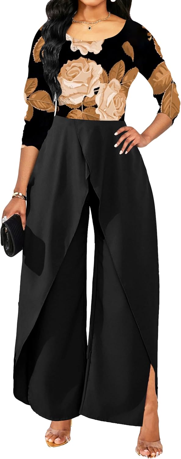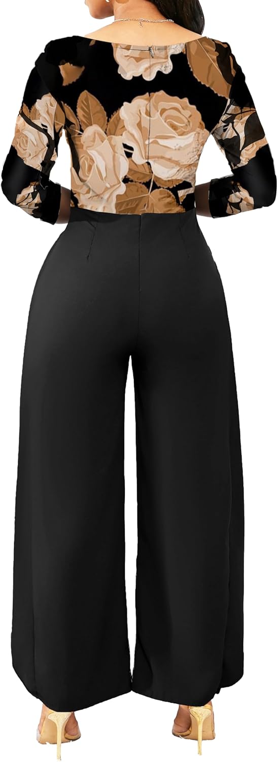 Sixe XXL Casual Floral Jumpsuit for Women Dressy Elegant Scoop Neck Long Sleeve Long Pants Cocktail Party Rompers