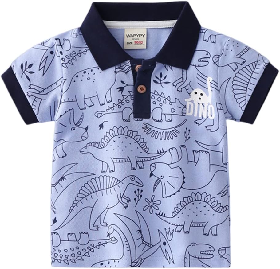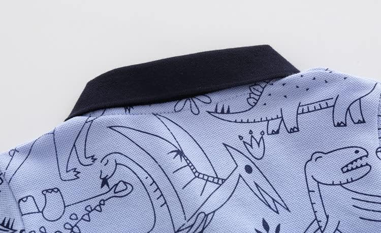 Features: A basic and classic little boys polo shirt with turn down collar, two buttons. A wardrobe must-have. Button v neck undershirt, Stays tucked, Classic fit. Premium raw edge seams provide an updated. Ribbed cuffs, color contrast design, color block, cute cartoon print dinosaur.