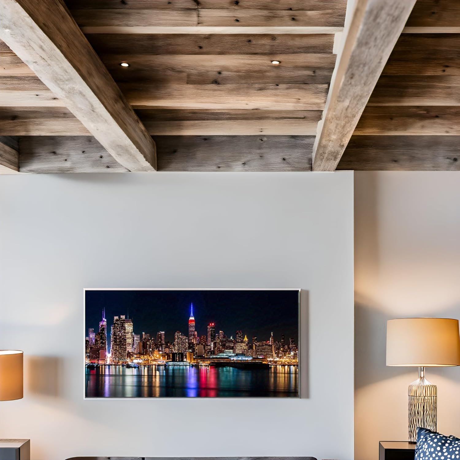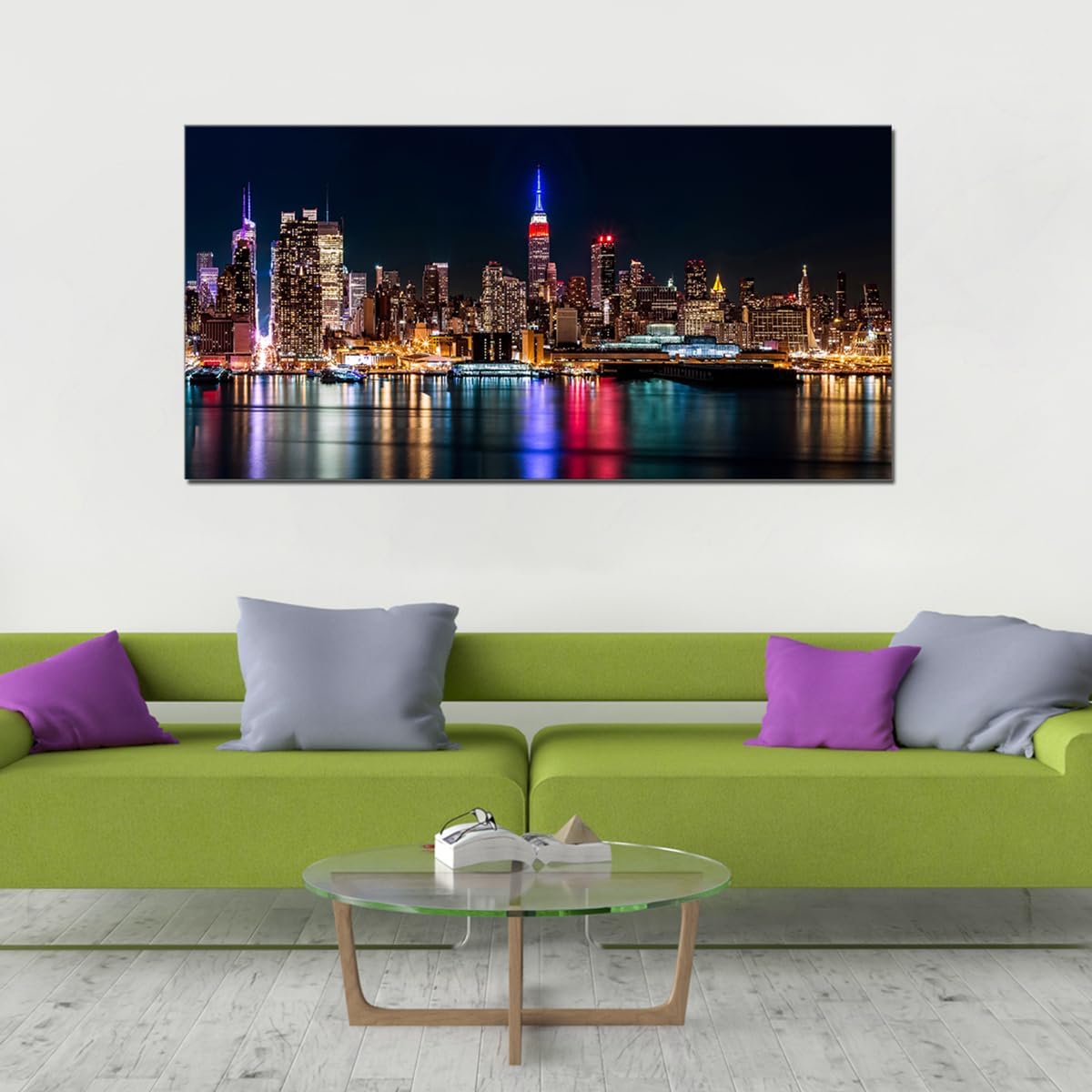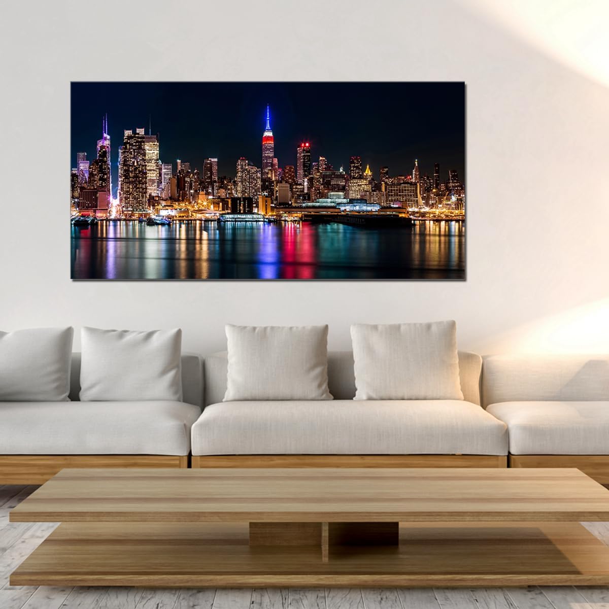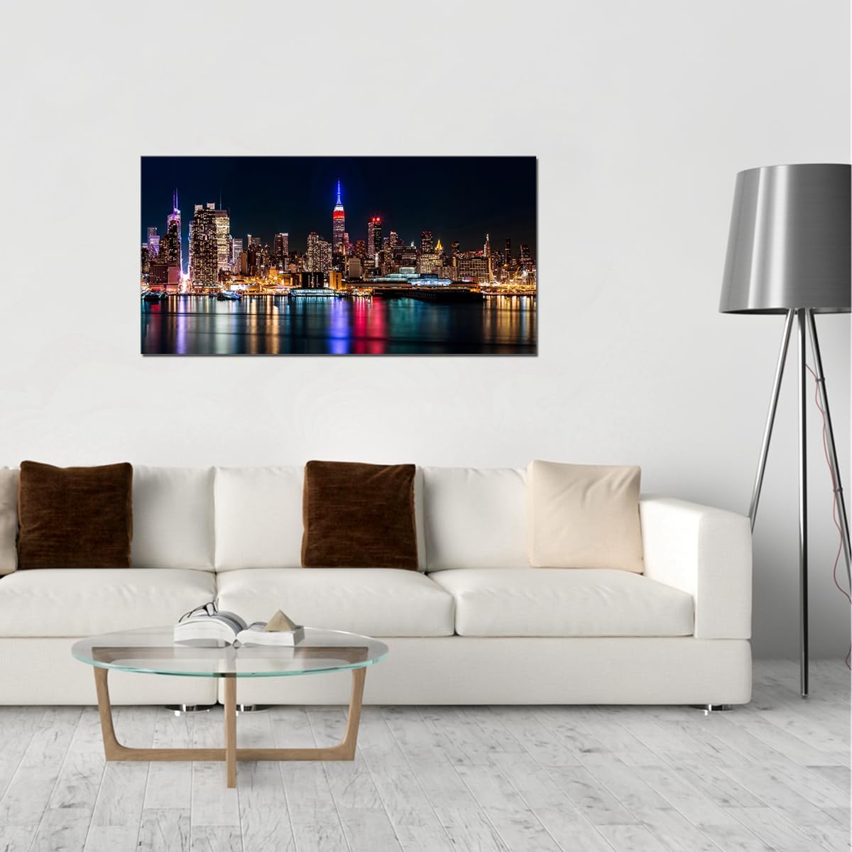 Size 10x60 1.【INNER WOODEN FRAME INCLUDED】Hang the framed artwork any way you like. Manhattan Skyline at Night City Landscape Picture