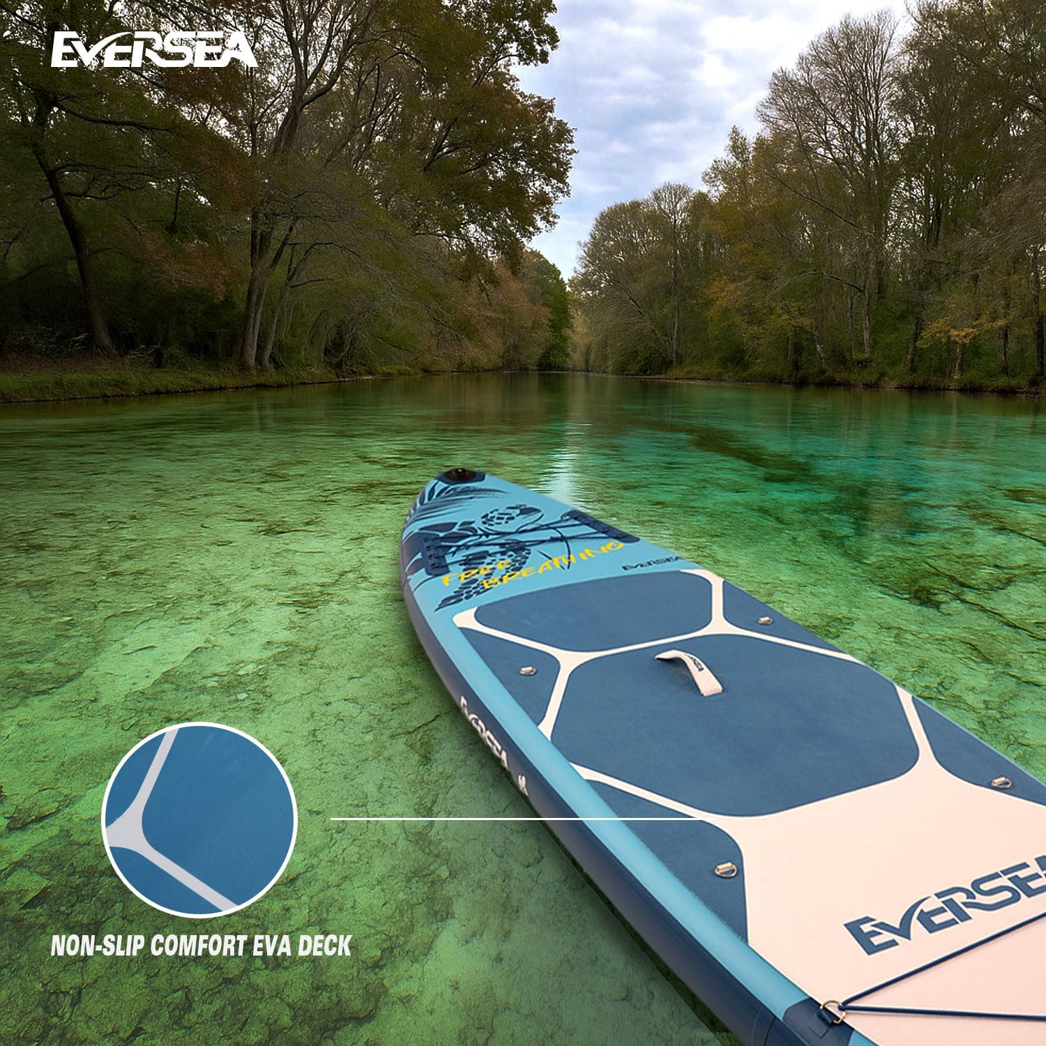 Size 11 ft EVERSEA All-Around Paddle Board: When the blue waves meet the turtle shell totem, the EVERSEA inflatable paddle board transforms into a mobile oceanarium. This 32-in extra wide inflatable paddle board is suitable for various water activities like cruising, yoga, fishing, and more.