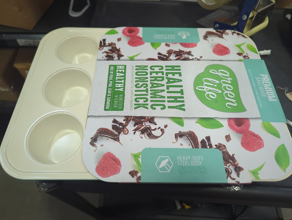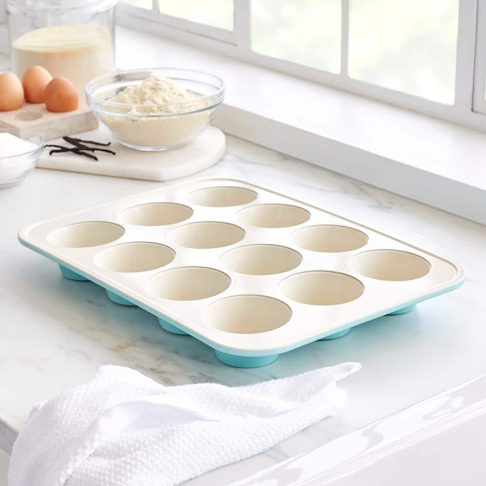 Size 12 Cup Have you ever had muffins stick to the pan? It's a surefire way to turn delicious anticipation into a disappointing mess. With a GreenLife muffin pan, that sticky situation is a thing of the past. Featuring out healthy ceramic nonstick coating, this pan makes it easy to create tasty, perfectly baked muffins that pop right out. Free of PFAS, PFOA, lead, and cadmium, our sand-derived coating will help to make them a little healthier, too. Crafted from heavy-duty steel for fast and even heat distribution, this pan has reinforced rims for enhanced strength and stability. Oven safe up to 450°F. Hand wash only.. Cleaning Instructions: Hand Wash Only. Color Family: Turquoise. Color/Finish: Turquoise. Features: Nonstick,Oven Safe,Refrigerator Safe. Included: No Additional Items Included. Kitchen Product Type: Bakeware. Material: Aluminum. Number of Cups: 12. Number of Pieces: 1. Package Type: Individual. Pan Shape: Oval. Pan Type: Classic. Returnable: 90-Day. Product Height (in.): 15 in. Product Length (in.): 11 in. Product Width (in.): 1 in. Material: Aluminum. Number of Cups: 12