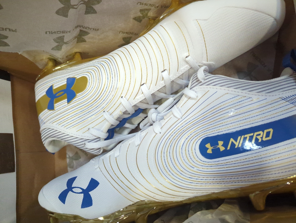 Size 15 UA UCLA Team Nitro Mid MC football cleats White-Gold-Blue