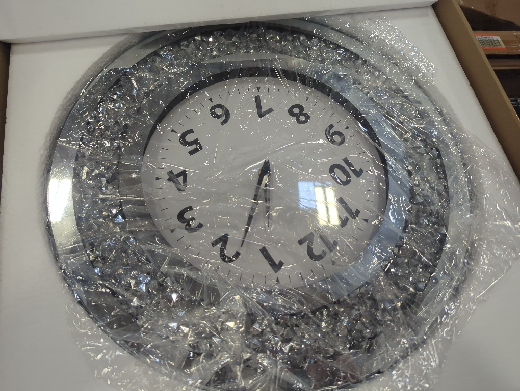 Clock Material: front surface all covered by silver mirror glass, excellent polished edge craft. Crush diamond for decoration. Quartz Clock.