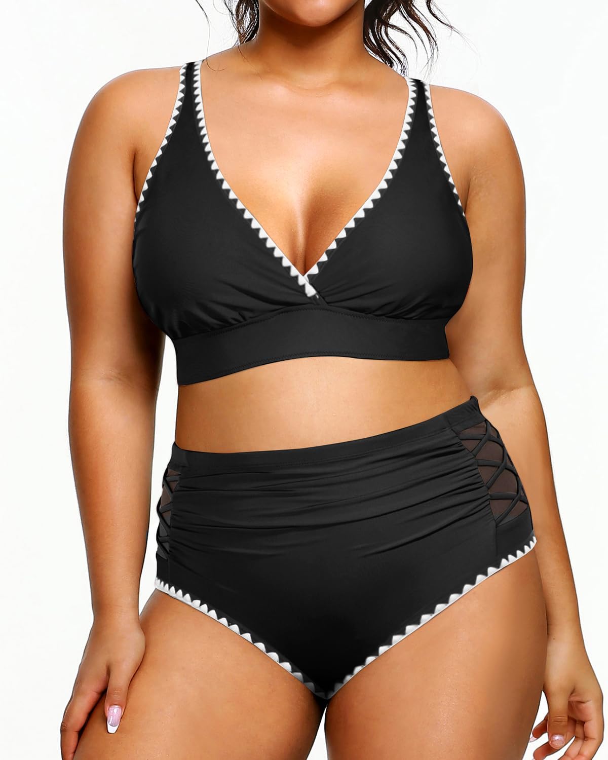 Plus Size Swimsuits: High waisted bikini bottoms with side lattice mesh insets offer full coverage while still maintaining a sexy appeal. The ruched and fully lined swim bottom provides effective tummy control and ensures your safety.