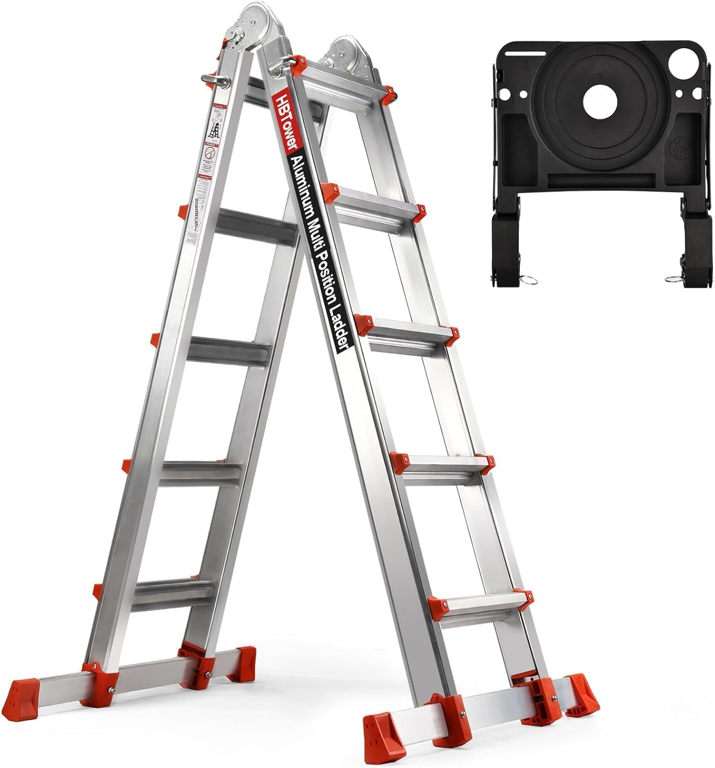 Size 19ft color orange HBTower A Frame 5 Step Extension Ladder, 19 Ft Multi Position Ladder with Removable Tool Tray and Stabilizer Bar, 330 lbs Capacity Telescoping La dder for Household and Outdoor Work (Orange, 19FT)