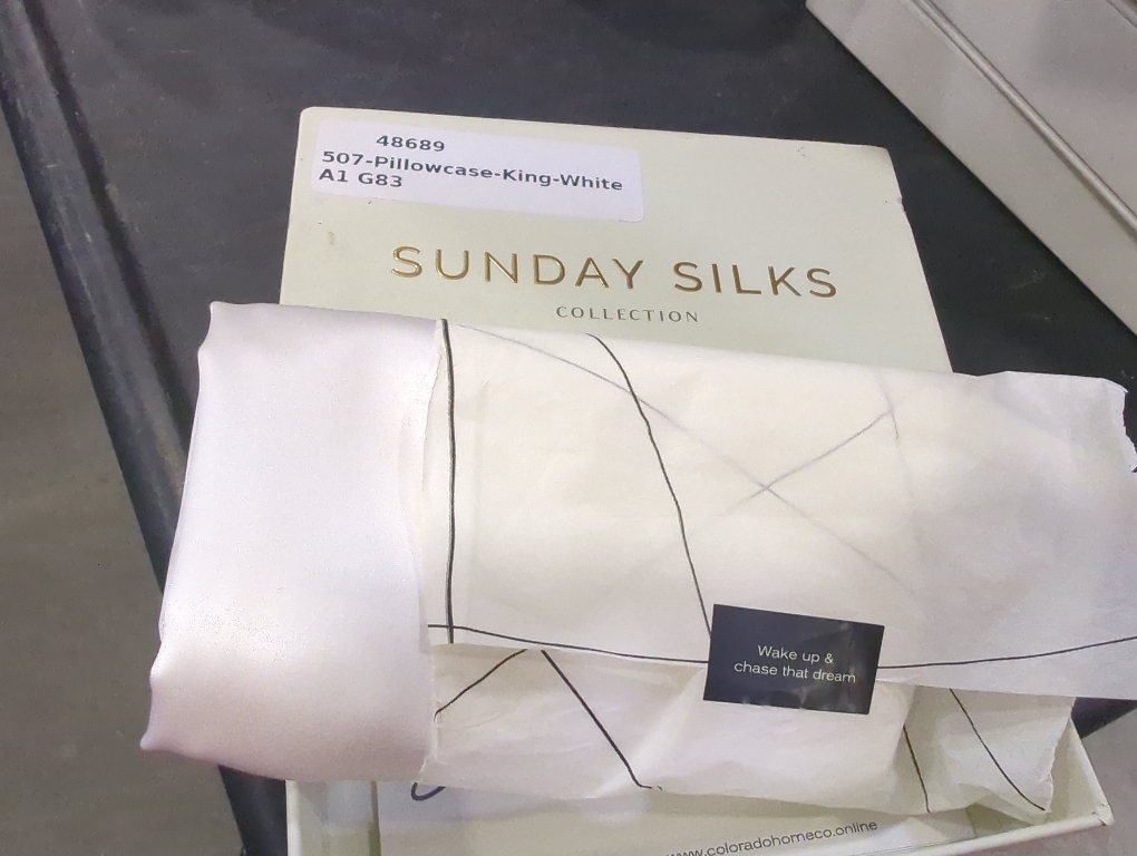 New Open box for inspection Size 20x36 Color White FEEL THE SUNDAYSILKS LOVE: Snuggle into the world's softest & best silk pillow case king size 20x36" Sourced from the #1 natural silk fibres on earth and carefully handmade for durability. Your mulberry silk pillowcases are sustainably OEKO-TEX Certified.