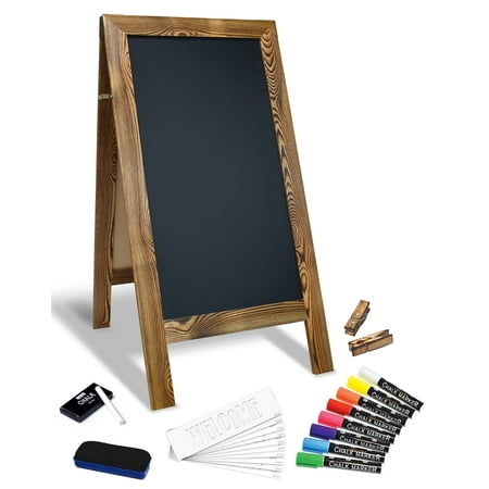 Size 20x40 A-FRAME SANDWICH BOARD - Double-sided, free-standing board, each side is 20" wide x 40" tall; chalkboard is 15" x 28.5"; item stands 26.5" apart and 38" high when fully erected DOUBLE-SIDED MAGNETIC CHALKBOARD - Two non-porous writing surfaces (15.3" x 28.8") accommodate magnetic clips, chalk, and liquid chalk markers DELUXE SET - Includes all you need to create beautiful messages on the board: 8 assorted-color liquid chalk markers, chalk, an eraser, 2 rustic clothespin magnets, & 10-piece stencil set REAL WOOD FRAME - Rustic, weathered looking painted frame made of pine EASY TO CLEAN - When using chalk marker, simply wipe the non-porous surface with a wet cloth until chalk marks are gone (Standard chalk with chalk erasers can also be used.)