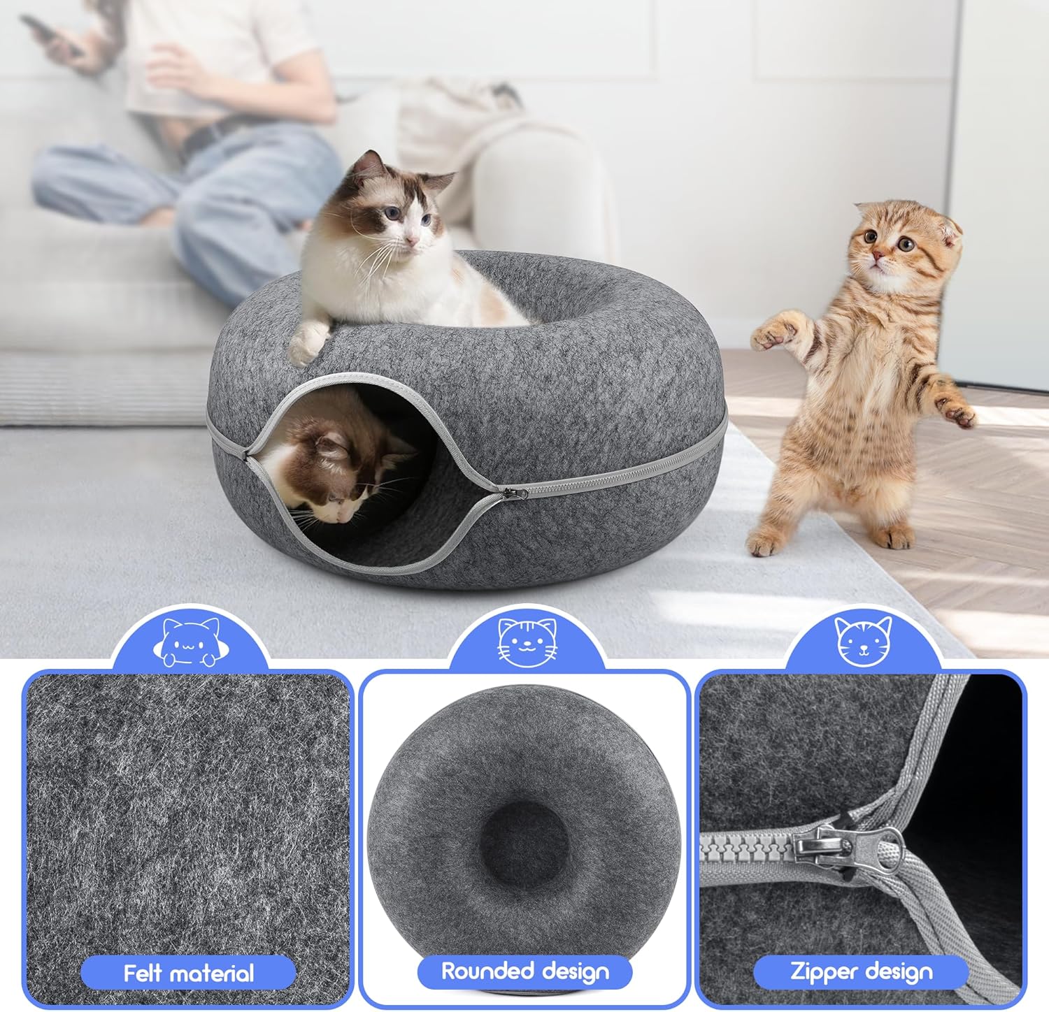 Size 24" x 24" x 11", Dark Grey, 2 PCS Tunnel Bed Peekaboo Cave for Multiple & Large Cats, Scratch Resistant, Washable & Detachable Round Felt Donut Tunnel up to 24 Lbs, 24" x 24" x 11", Dark Grey, 2 PCS