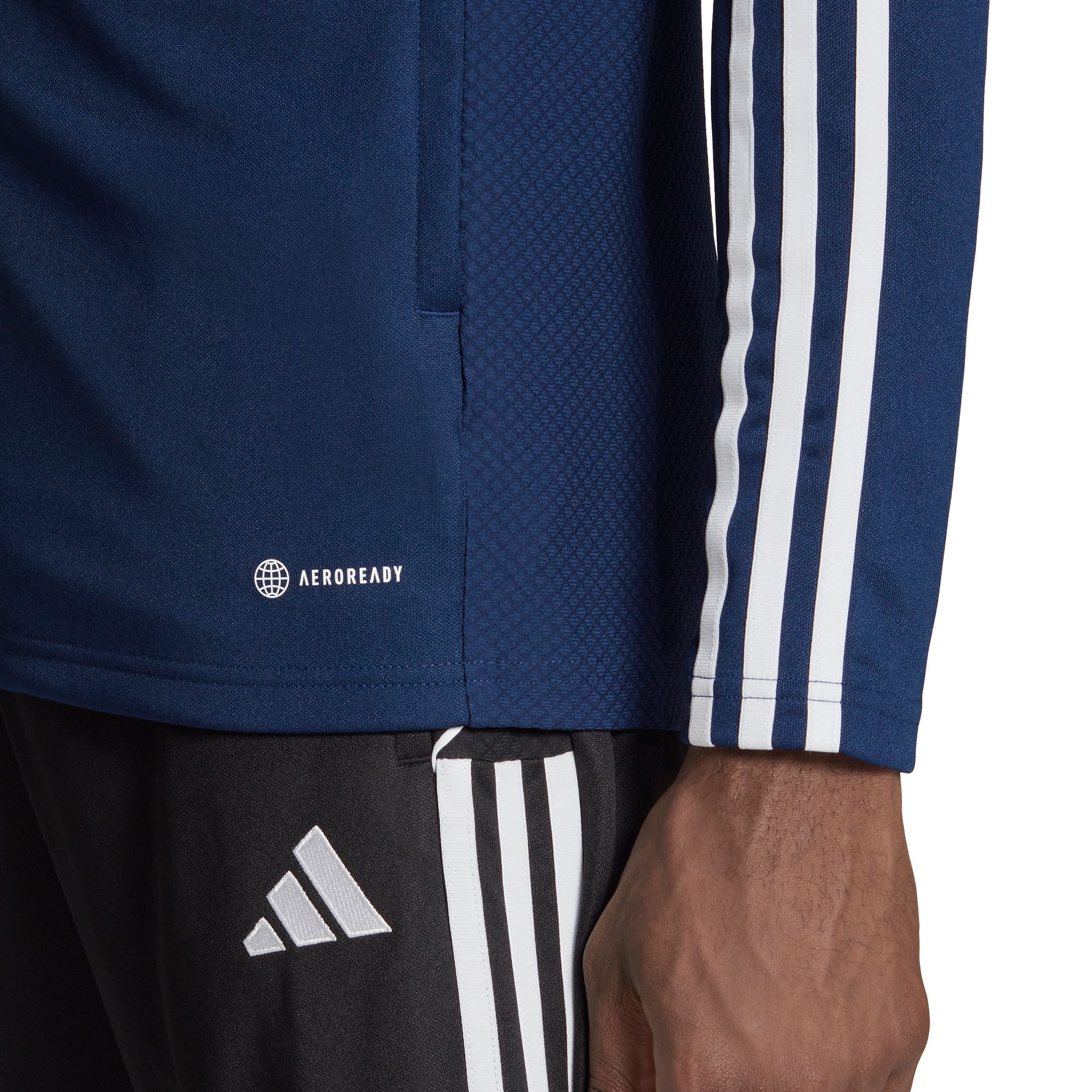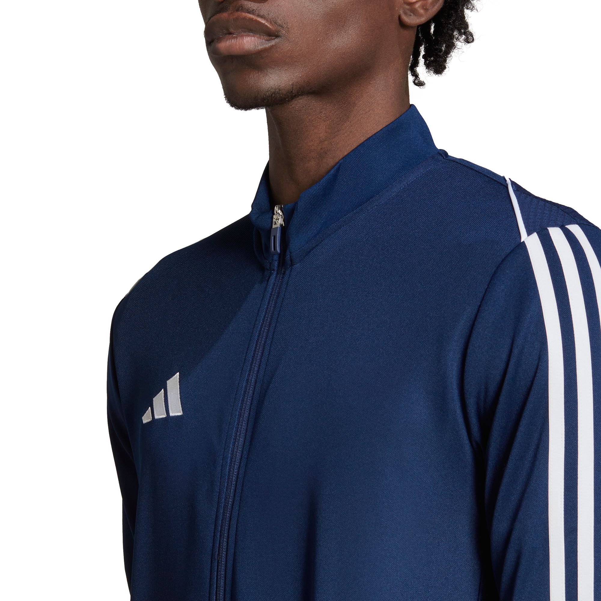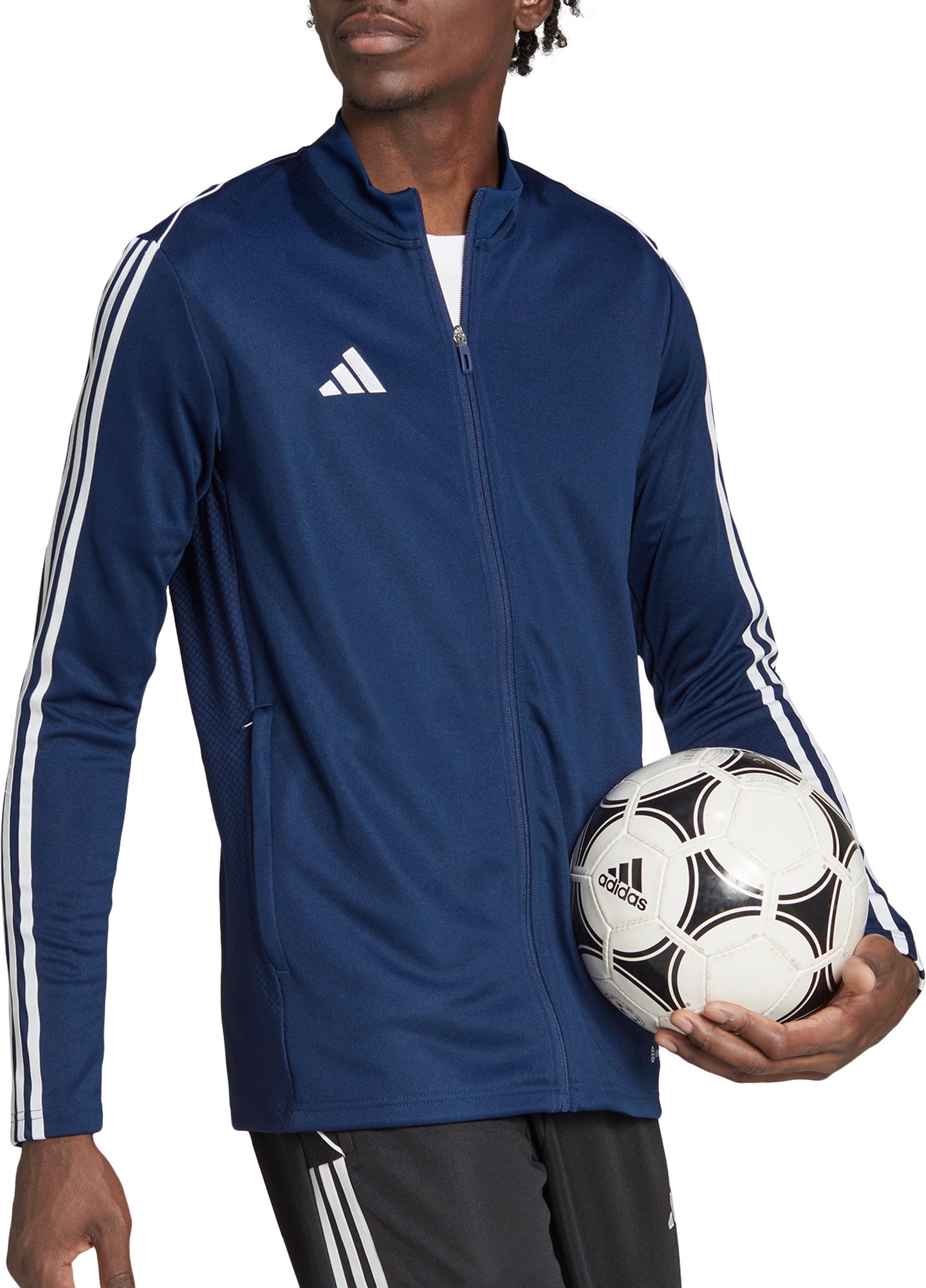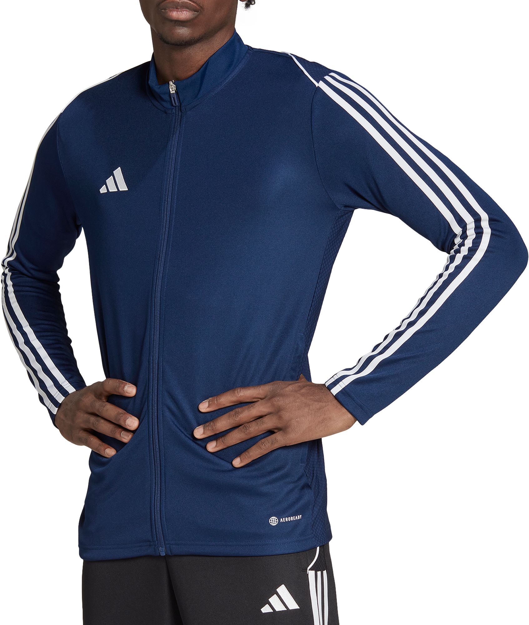 Born for the beautiful game. Its soft fabric and stand-up collar make this adidas soccer jacket the perfect extra layer on the training pitch. Part of the Tiro 23 League range, it'll keep you dry and comfortable even when it's zipped all the way up, thanks to moisture-absorbing AEROREADY. Its slim, streamlined fit means you can keep it on when you're in the thick of the action.