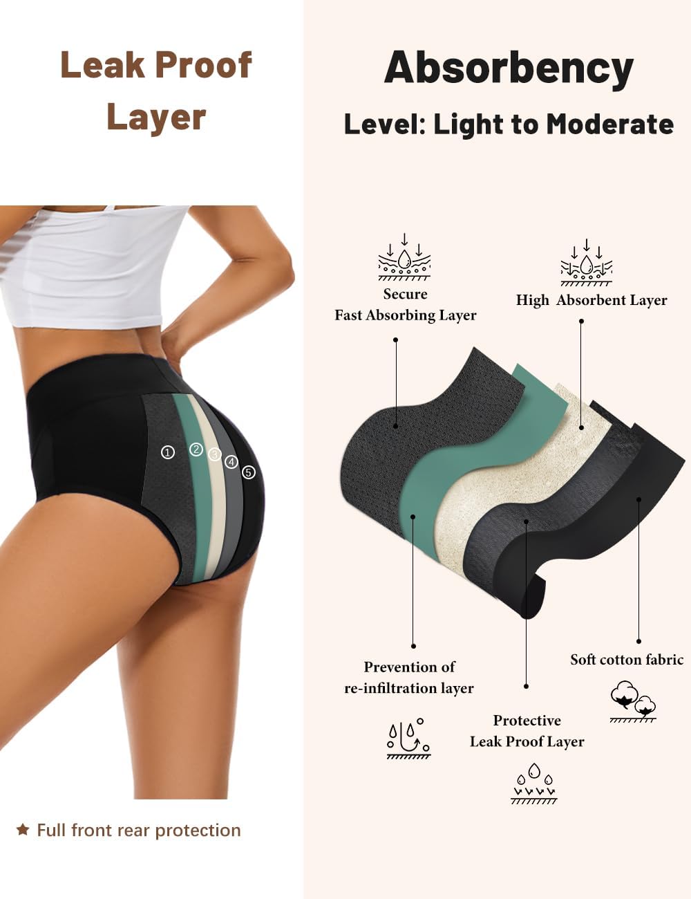 From front to rear protection: The higher front liner quickly absorbs and lock the moisture, the wider back leak proof layer for secure protection against leaks and stains. It’s a nice backup to tampons, cups, pads during heavier flows.