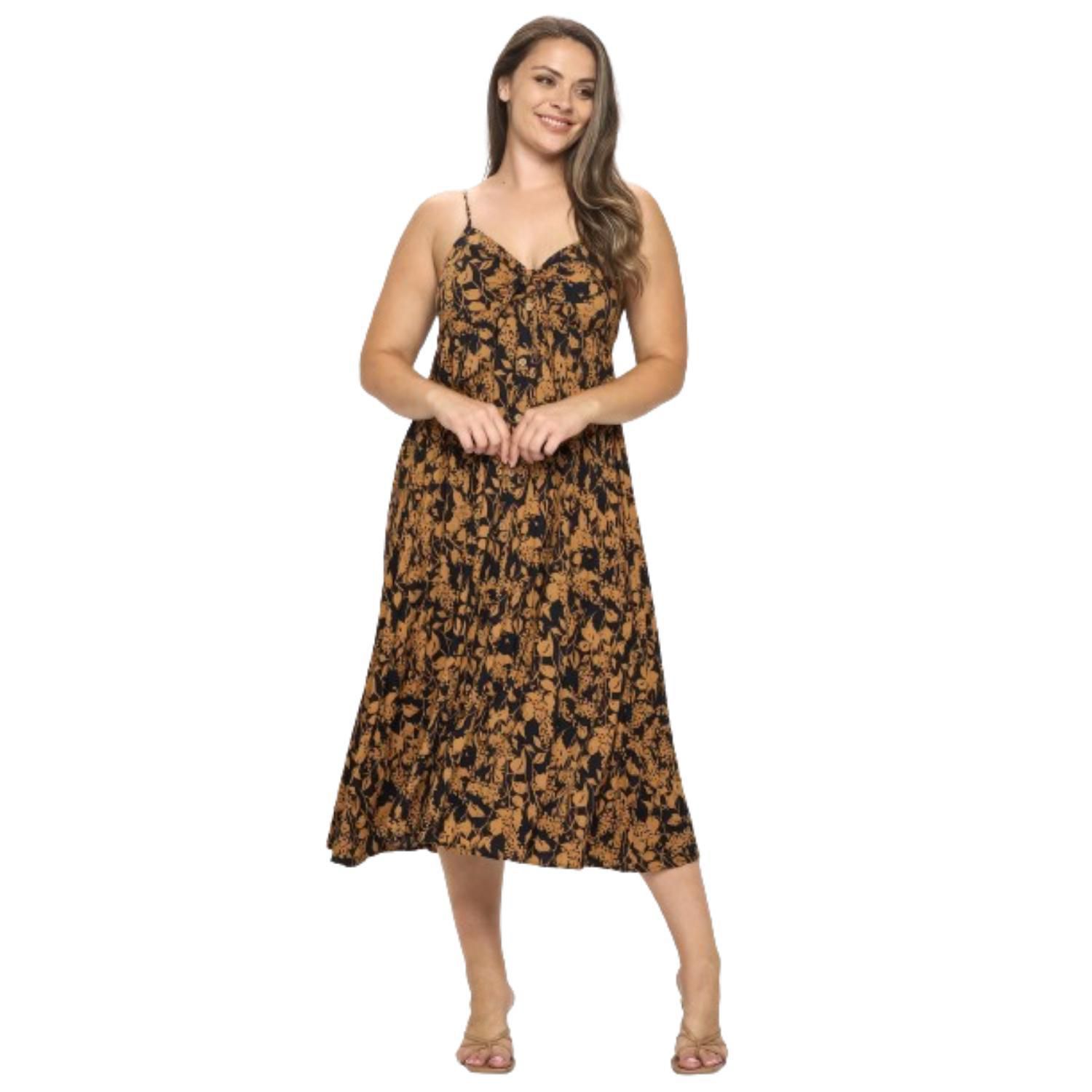 Elevate your plus-size fashion with our Brown/Black Plus Botanical Print Front Tie Maxi Dress, available in sizes 1XL, 2XL, and 3XL. Crafted from 100% rayon, this dress features a captivating botanical print, a front tie detail, and a flowing maxi silhouette for a chic and effortless look.