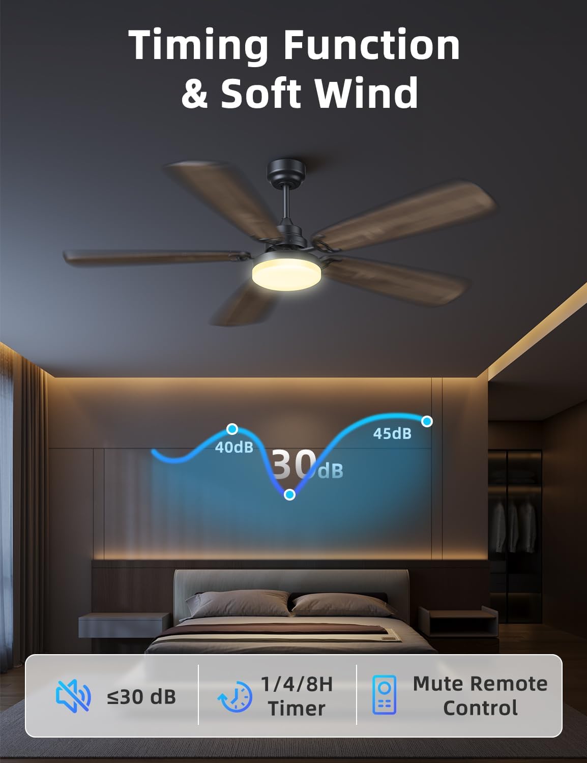 6-Speed Settings with Timer Options: Tailor your comfort with 6 adjustable speed settings, powered by a quiet DC motor that delivers strong, consistent airflow; The ceiling fan also includes three timer functions (1H/4H/8H), allowing you to set the perfect duration for your comfort