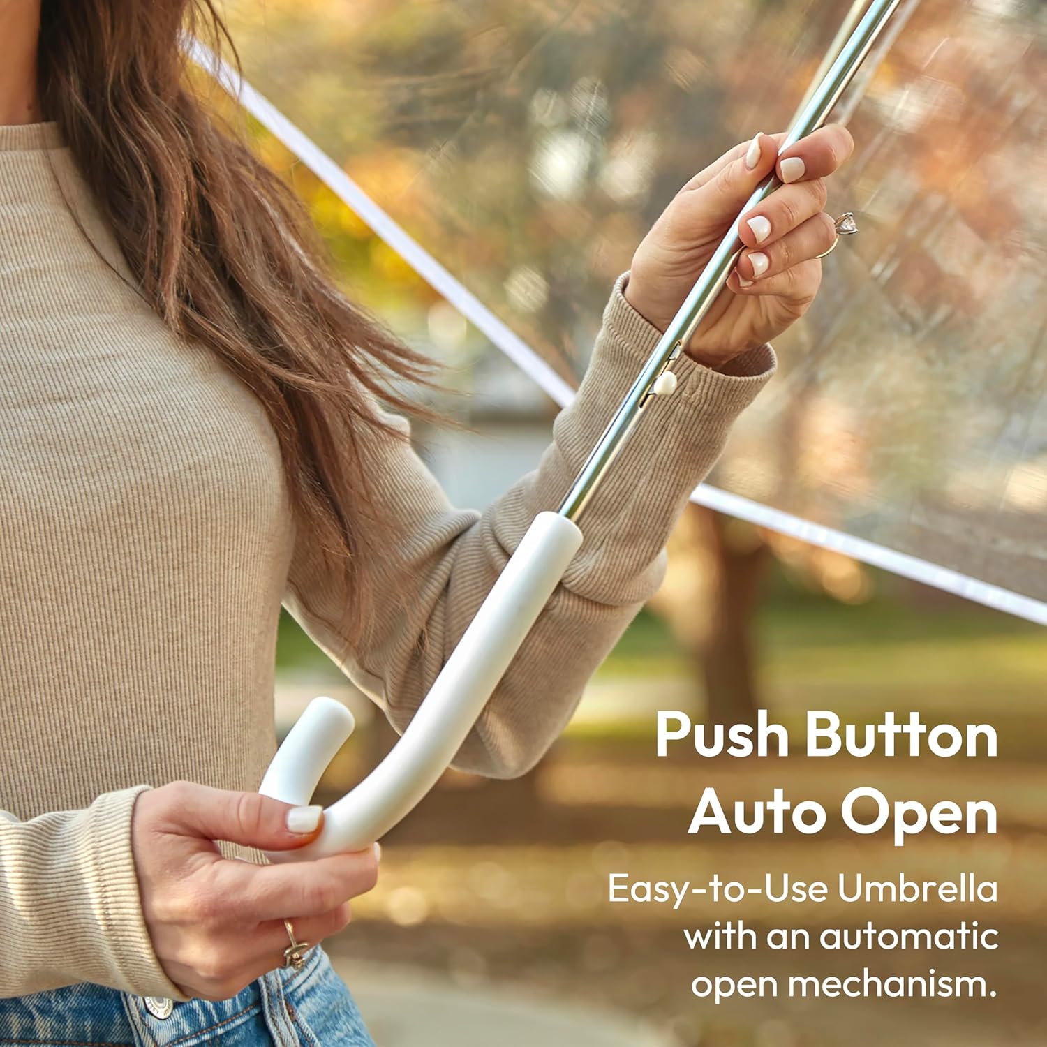 Size 52 BLOCK THE RAIN, NOT THE VIEW: Enjoy a panoramic view of your surroundings with our clear folding umbrella, designed for optimal visibility and style. The transparent canopy allows you to see where you're going while staying dry; with a push of a button, the canopy automatically opens for easier and faster rain protection