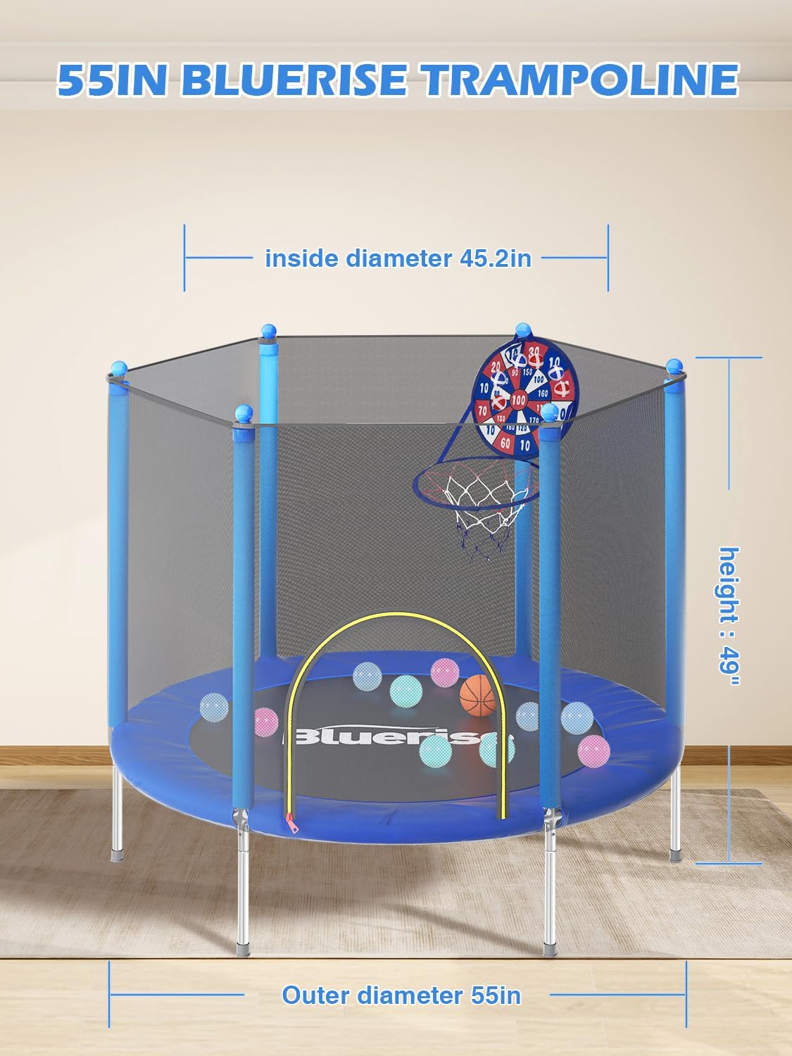 【Perfect Gift】The newly upgraded trampoline is an ideal Christmas gift for your toddlers 1-6. BLUERISE 55IN trampoline with basketball hoop provides great fun and jumping exercise.