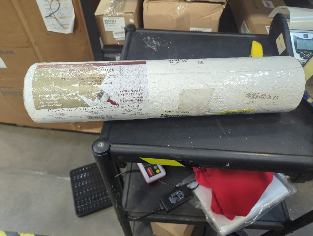 New Open box for inspection Size 56 Color White Soft lines create this paintable Jacobean tile design. Vines with leaves are encompassed within areas in this unique design. This will add dimension and depth to any room in your office or home.. Application Type: Pre-pasted. Color: White. Color Family: White. Commercial/Residential: Commercial,Residential. Features: Moisture resistant,Paintable,Washable. Finish: Textured. Lifestage: Adult. Match Type: Straight across. Material: Vinyl. Number of Rolls Included: 2. Pattern Type: Geometric. Pattern name: Jacobean Tile Paintable Wallpaper. Product Weight (lb.): 3 lb. Removal Type: Peelable. Returnable: 90-Day. Roll Length: Double Roll. Style: Classic,Farmhouse. Style: Art Deco. Area Coverage Per Roll (sq. ft. for each roll): 56. Product Length (ft.): 33 ft. Product Thickness (in.): .01. Product Width (in.): 20.5 in. Application Type: Pre-pasted. Finish: Textured. Features: Moisture resistant. Features: Washable. Pattern Type: Geometric. Material: Vinyl. Features: Paintable. Roll Length: Double Roll