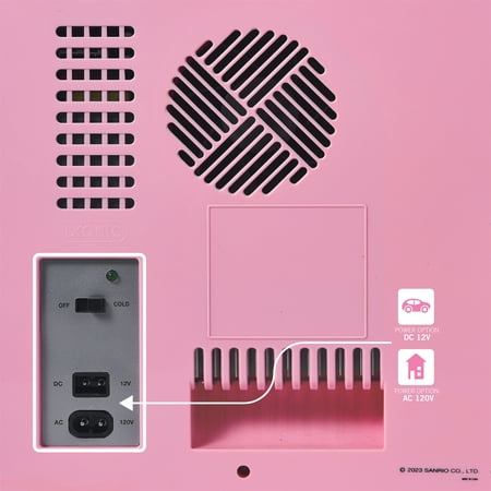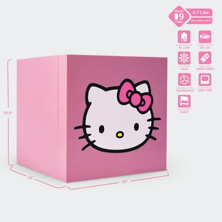 UNTESTED Size 6.7 Hello Kitty Pink Compact thermoelectric cooler with Hello Kitty's friendly face. Officially licensed Sanrio product. Great for small spaces: a bedroom, playroom, RV, or bathroom vanity. Includes cooler, 120V AC power cord with polarized plug, shelf, door shelf, 12V DC cable (vehicle power), and instructions. Exterior measures 3 apples tall (actually it's 10.4" tall x 10" wide x 10" deep). 6.7 L capacity-holds up to 9 12oz soda cans. Engineered with thermoelectric technology, free from CFCs and refrigerants. Cools to 36℉ below ambient temperature.