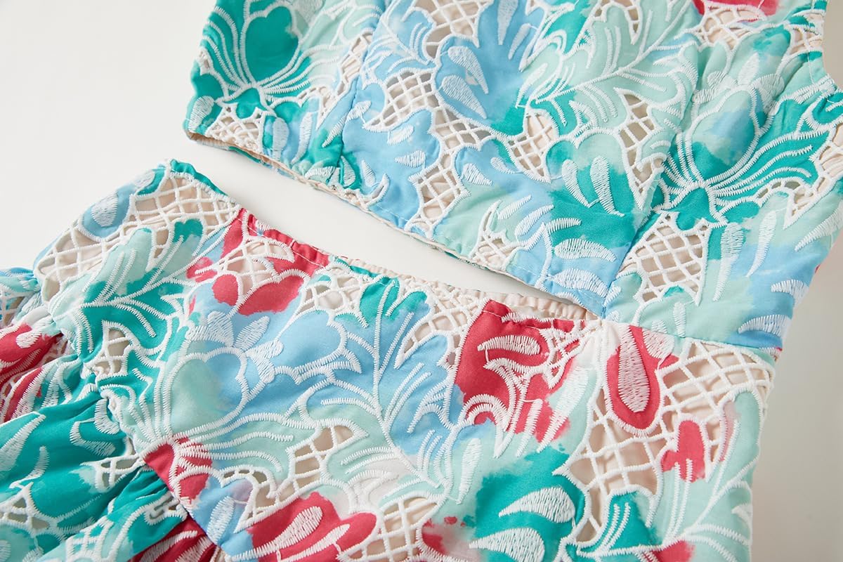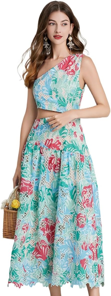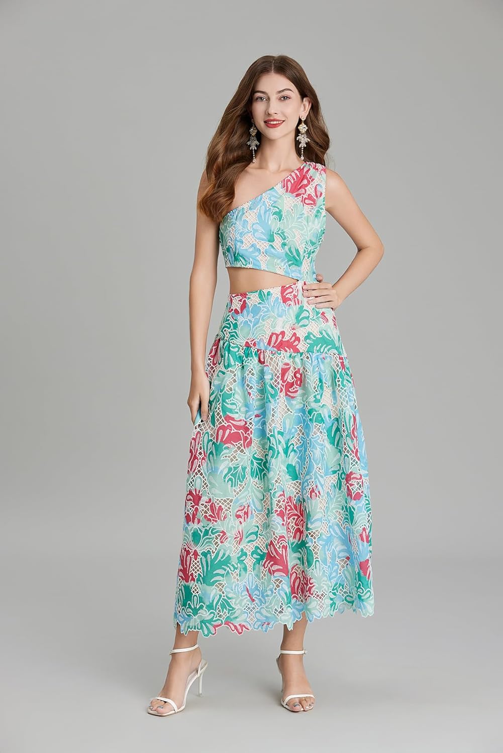 Size L/XLSunfere ..French Embroidery Cut-Out Print one-Shoulder, one-Waist Dress