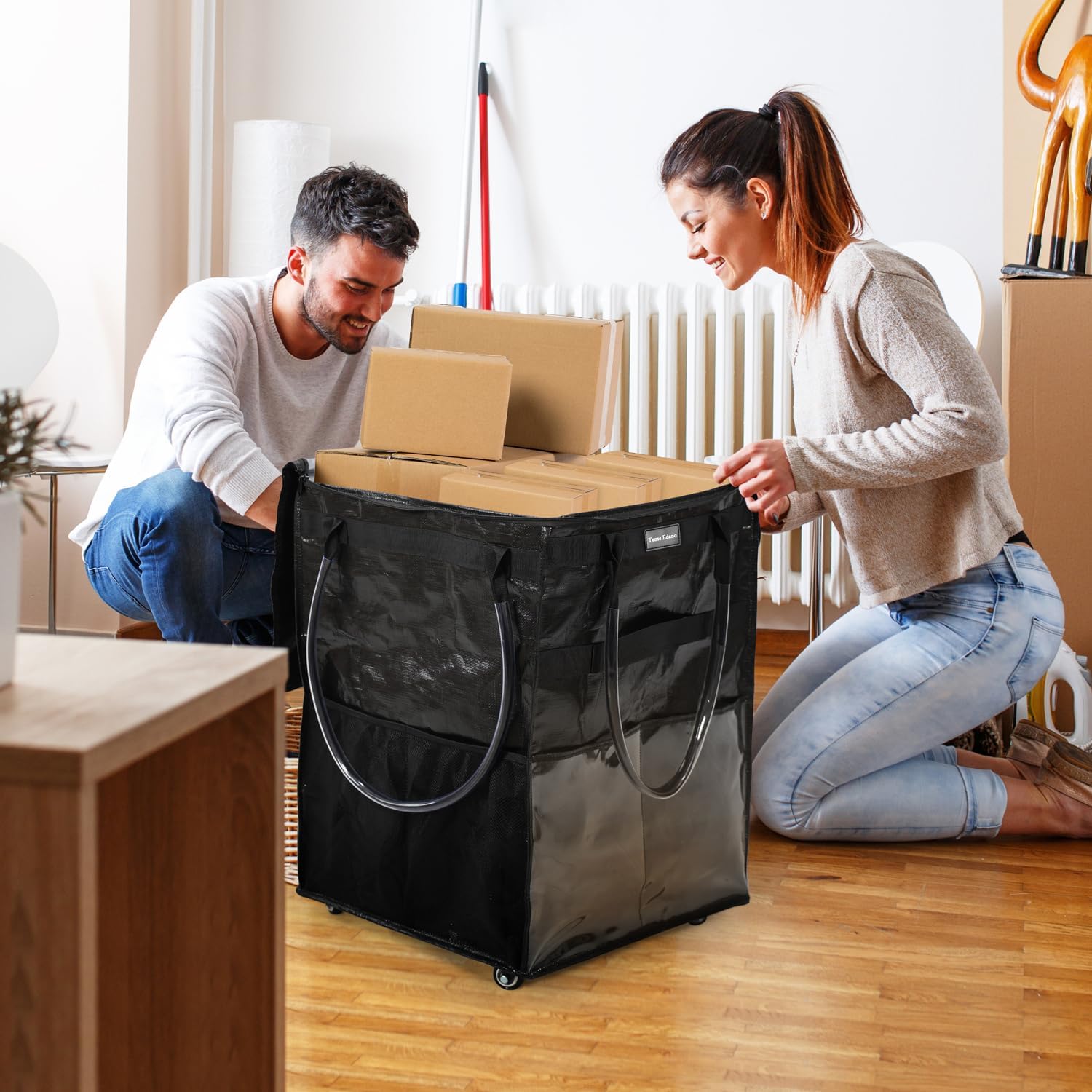 Size Large Color Black Reusable Grocery Bag On Wheels Large Capacity Shopping Trolley Foldable Rolling Tote with Outside Pocket, Heavy Duty Handle (Black, Large)