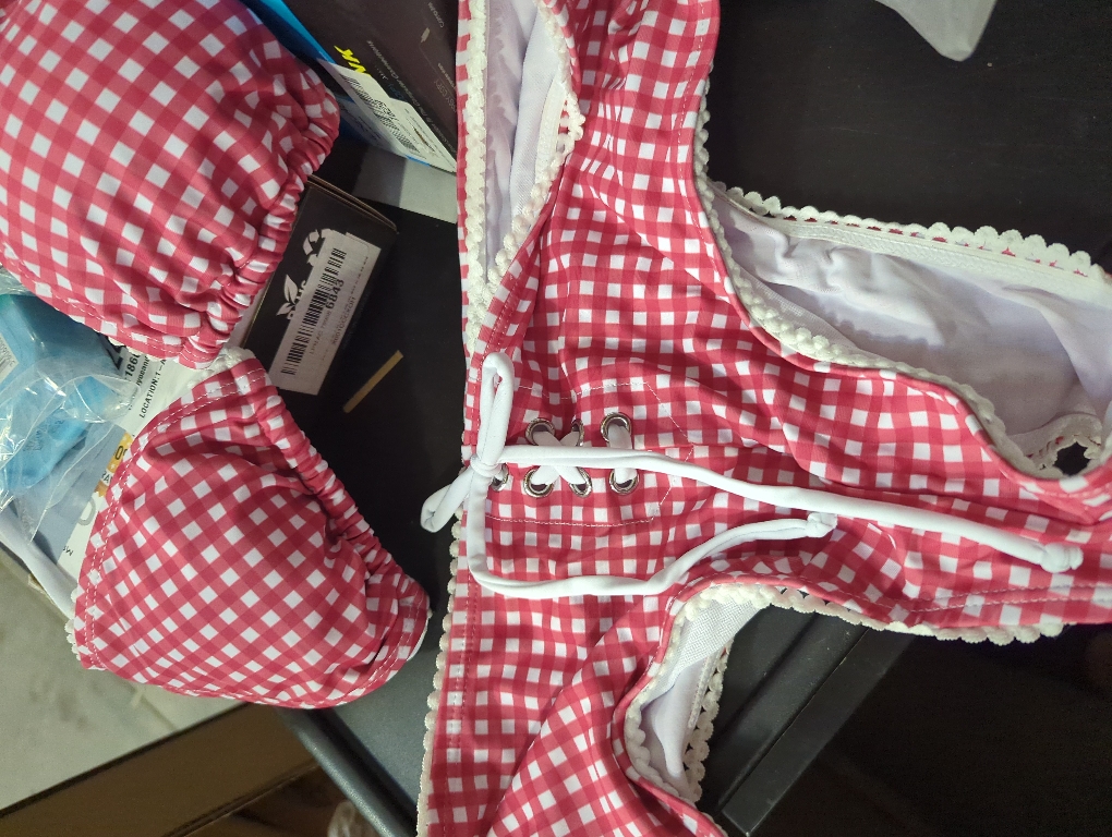 Size M Women's 2 Piece Plaid Bikini Set Gingham Halter String Triangle Bathing Suit Cheeky Swimshorts Swimsuits
