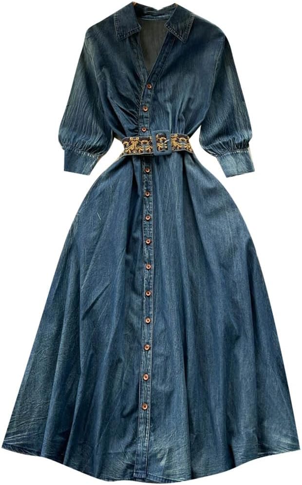 Size/M Women's French Vintage Denim Dress A-Line Long Half Sleeve Dress with Belt Casual Dresses