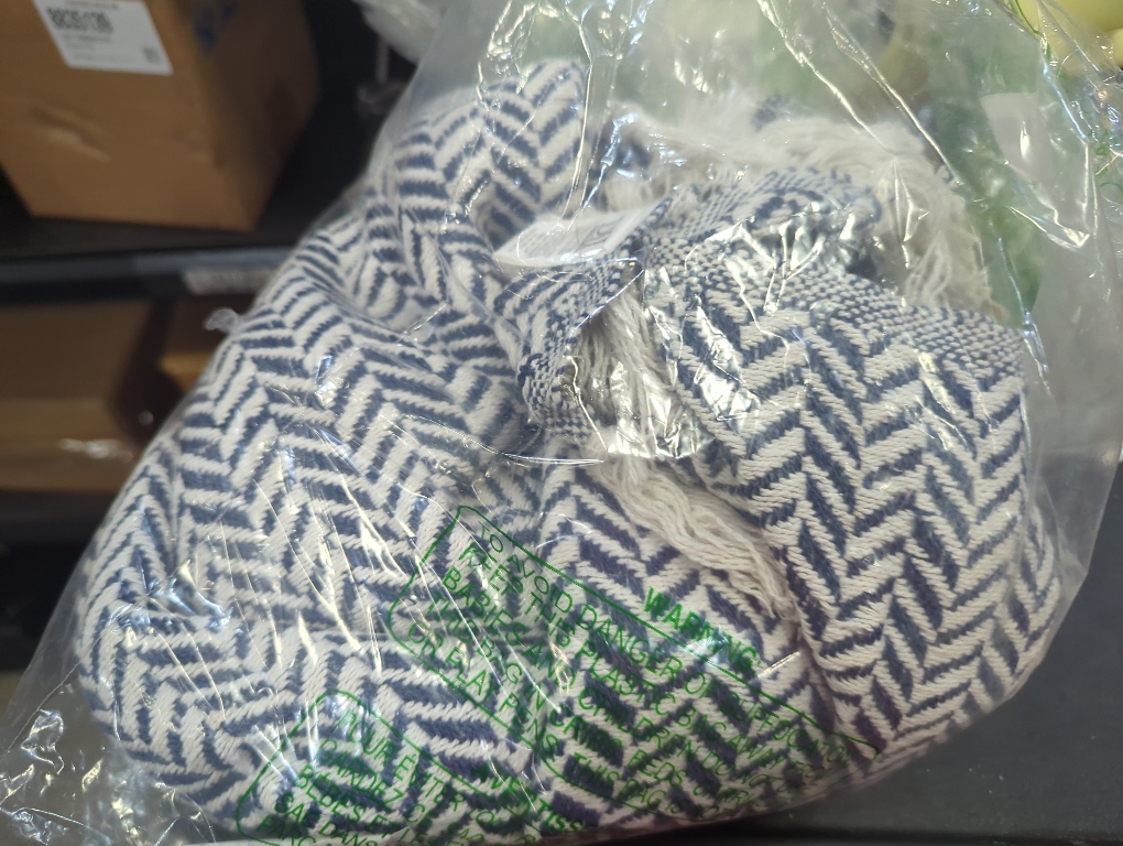 New no box Size medium Color Blue and grey DII These versatile throws will are a great addition to a living room or bedroom. DII offers a wide variety of throws in different colors, patterns, and materials to ensure you find the perfect one to match your vision of a perfectly balanced interior. Our throws are useful any time of the year, keep warm in the fall and winter season and freshen up your rooms with a pop of color during spring and summer. Keep one on your couch, chair, or bed for cozy nights by the fireside or take outdoors for chilly summer evenings on the porch or patio, or for a little picnic at your local park.