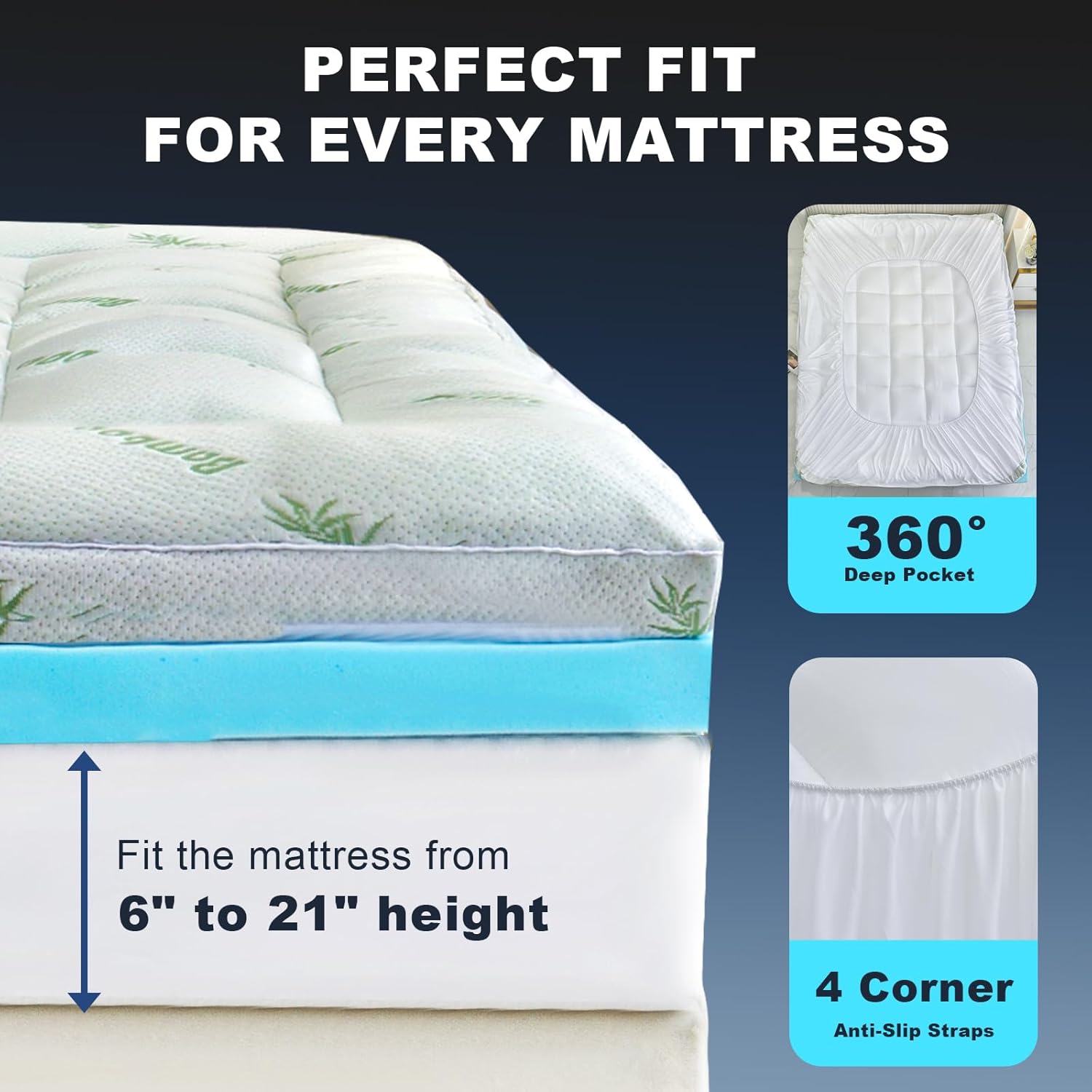 Deep Pocket Fit: With an 8-21 inch deep pocket, our mattress pad is compatible with a wide range of mattress sizes, ensuring a secure fit that won't slip or bunch during the night.
