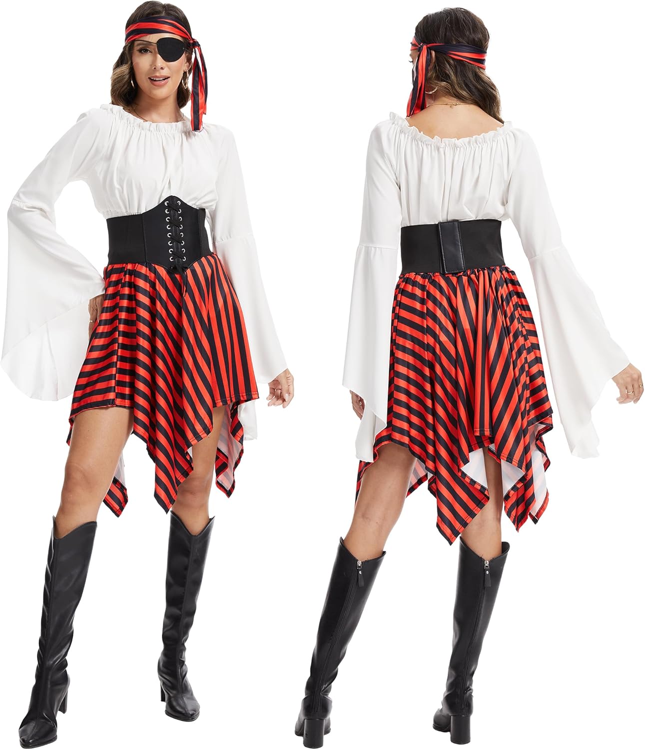 What's Included in the Package: The package comes with 1 piece of renaissance blouse top, 1 piece of tied corset waist belt,1 piece of red and black striped pirate skirt, 1*red headband,1*Pirate eye patch ,1 pirate hat, which will meet your need of taking a party or cosplay.