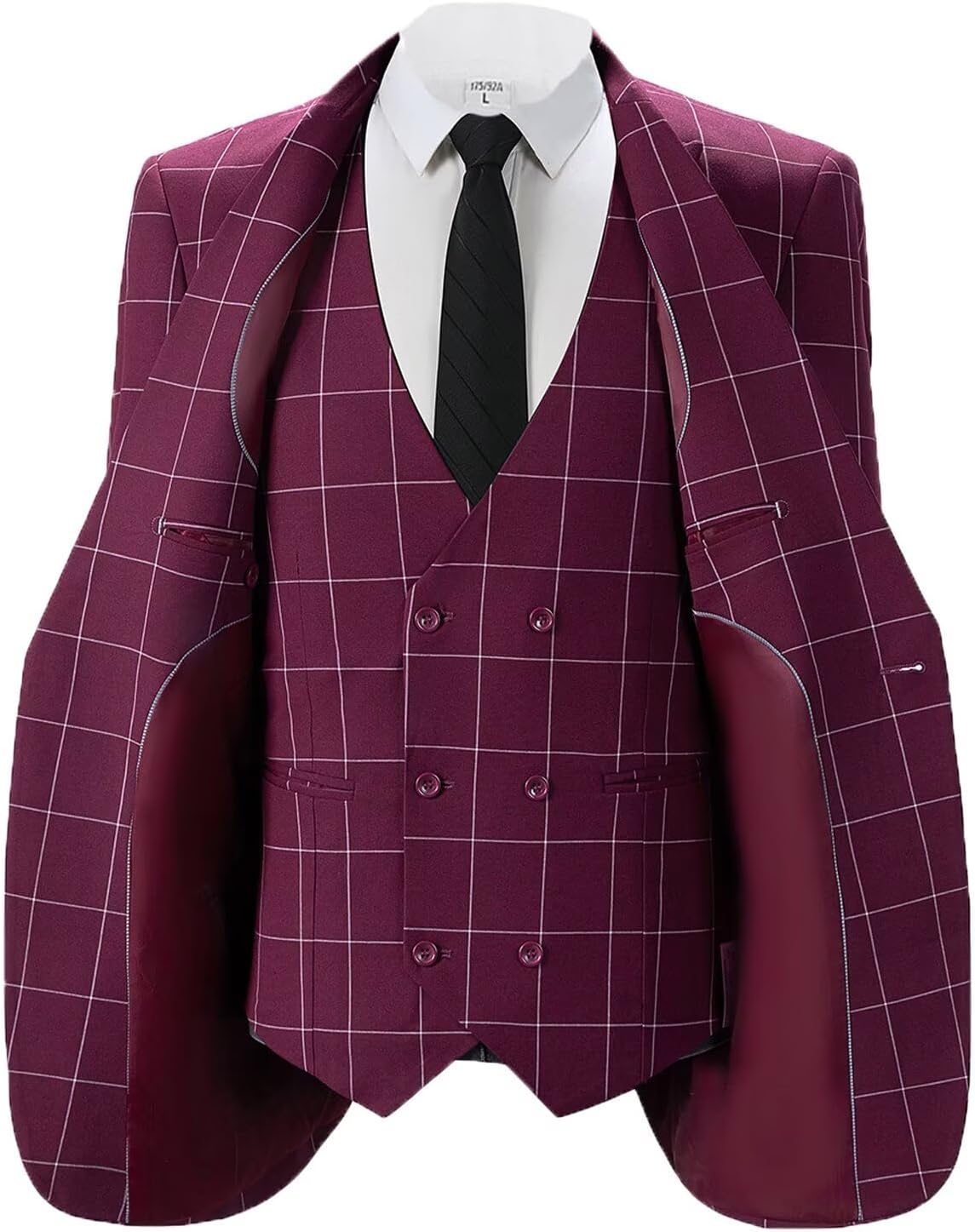3 Pieces plaid suit for men: 1 piece Blazer Jacket, Vest and Pants. Plaid Jacket: peak lapel, side split, long sleeve with 4 cufflinks, single breasted, 3 real pockets. Plaid Vest: double breasted, adjustable waist waistcoat. Plaid Pant: button and zipper closure, adjustable elastic waistband, striped pant with pocket.