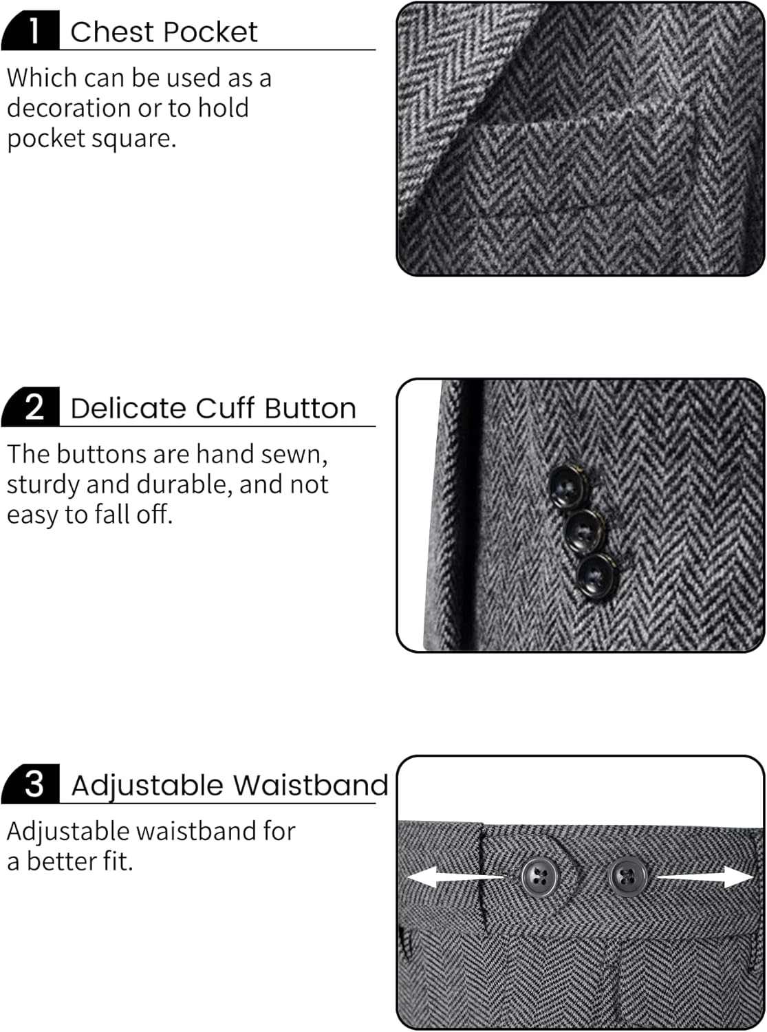OCCASIONS -- Men herringbone tweed suit set is great with dress shirts for wedding, groom/groomsmen, business, prom, homecoming, meeting, dinner, and so on. Also a good choice for some less formal activities, like party, graduation, date, banquet, easter, christmas outfits etc. From formal to informal, suitable for various occasions.