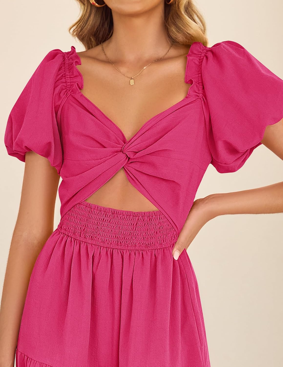 Size XL ... Womens Summer 2025 Boho Vacation Dress Short Puff Sleeve Flowy Smocked Cutout A Line Beach Party Dresses