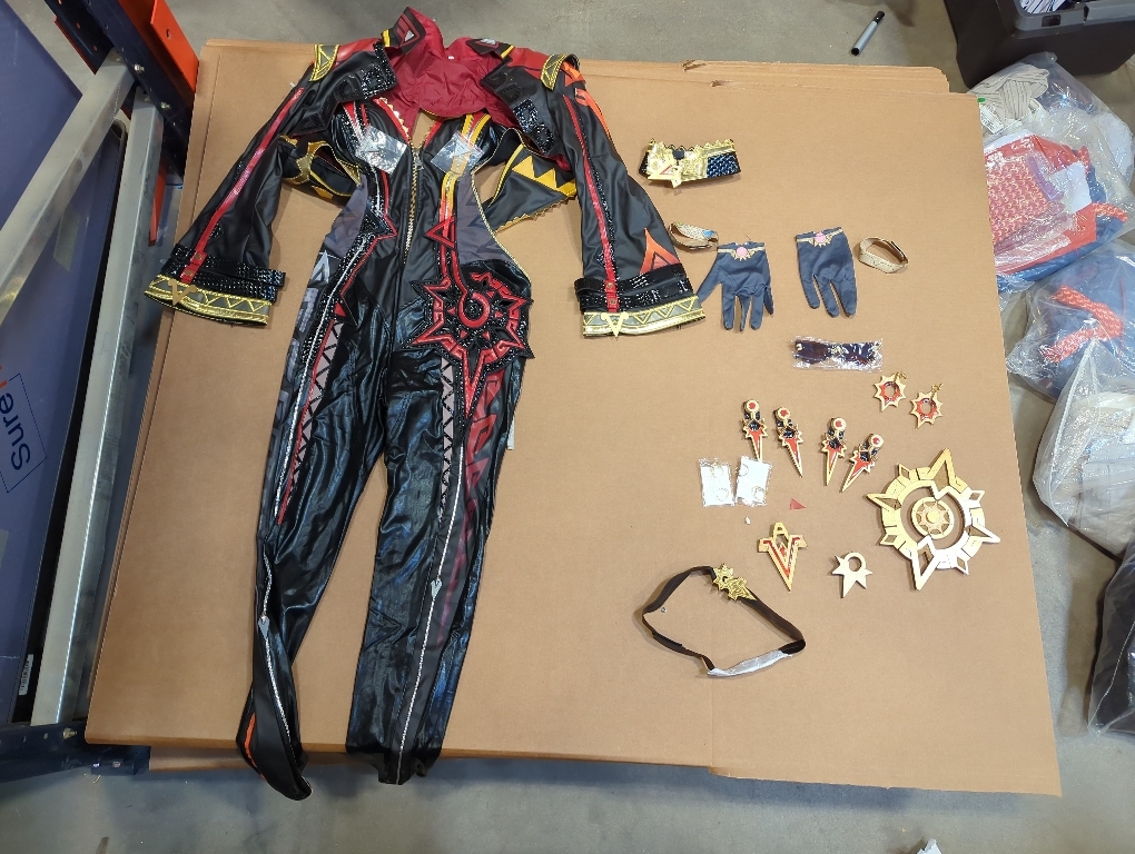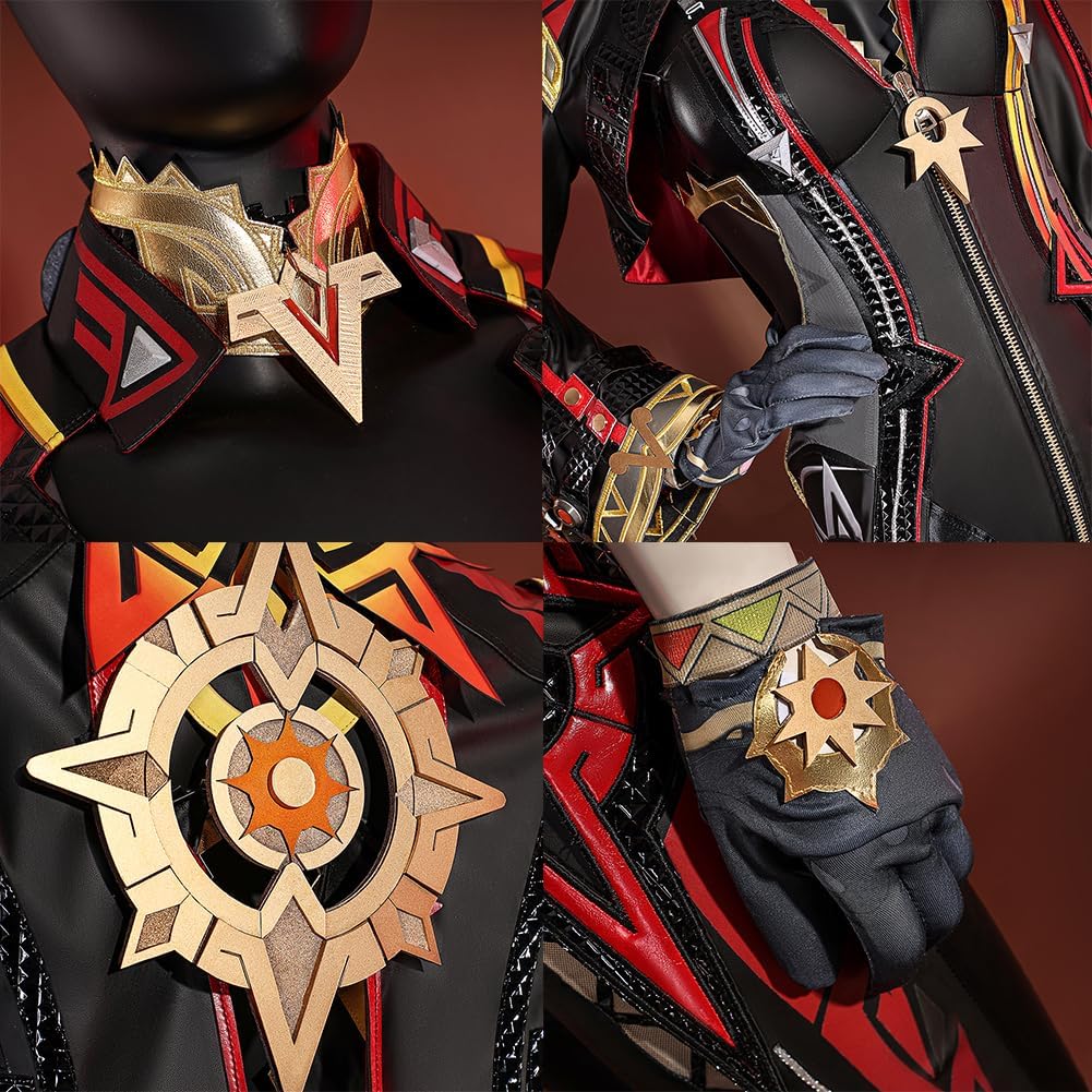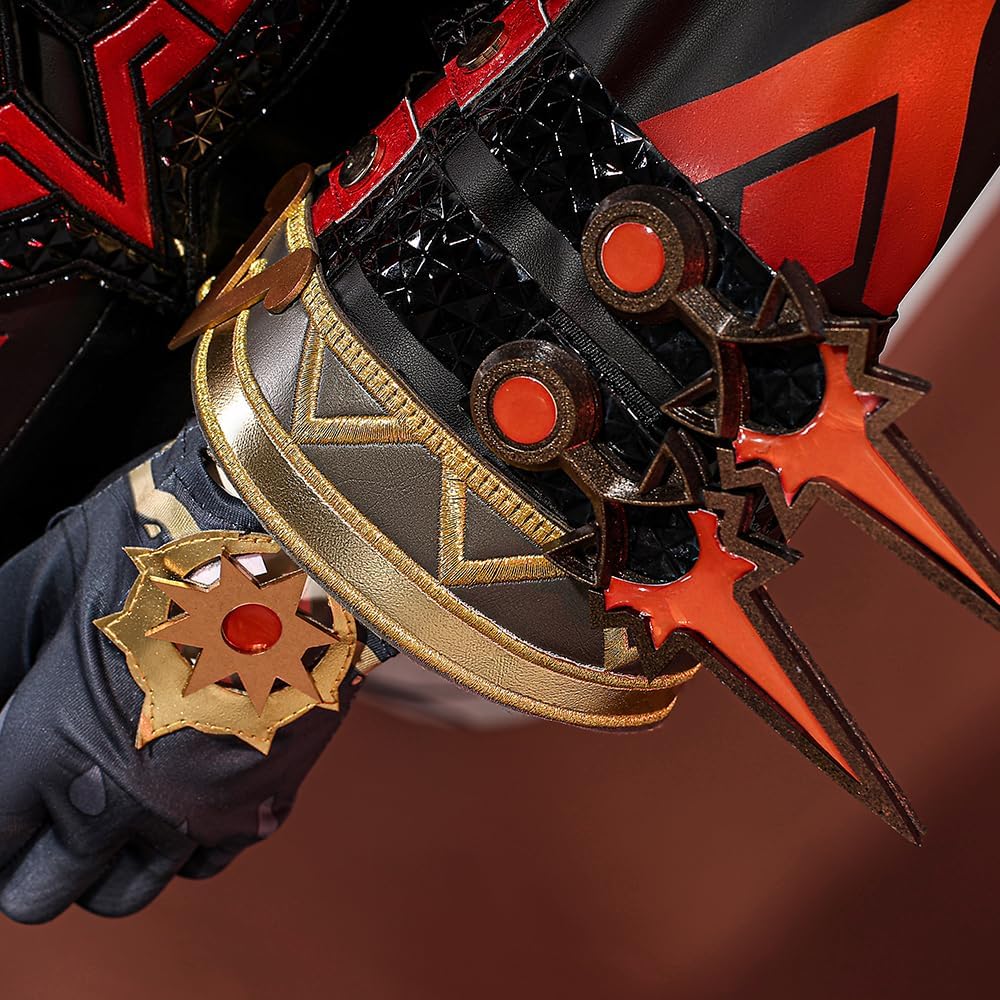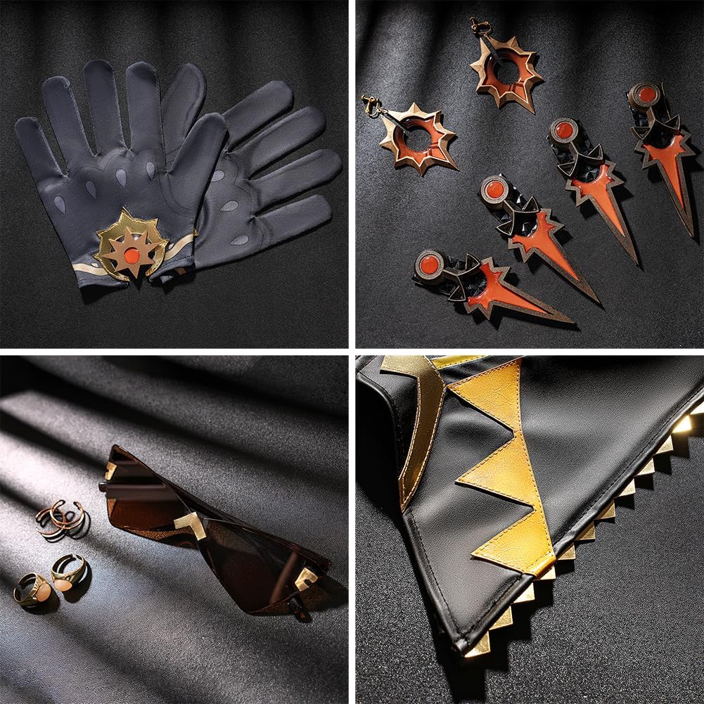 【Package Includes】The Genshin Impact Mavuika Costume include Jumpsuit Jacket Neck Ornament Earrings Sleeve Props Gloves Bracelet Sunglasses Ring Jacket and Back Armor. As the picture shows.