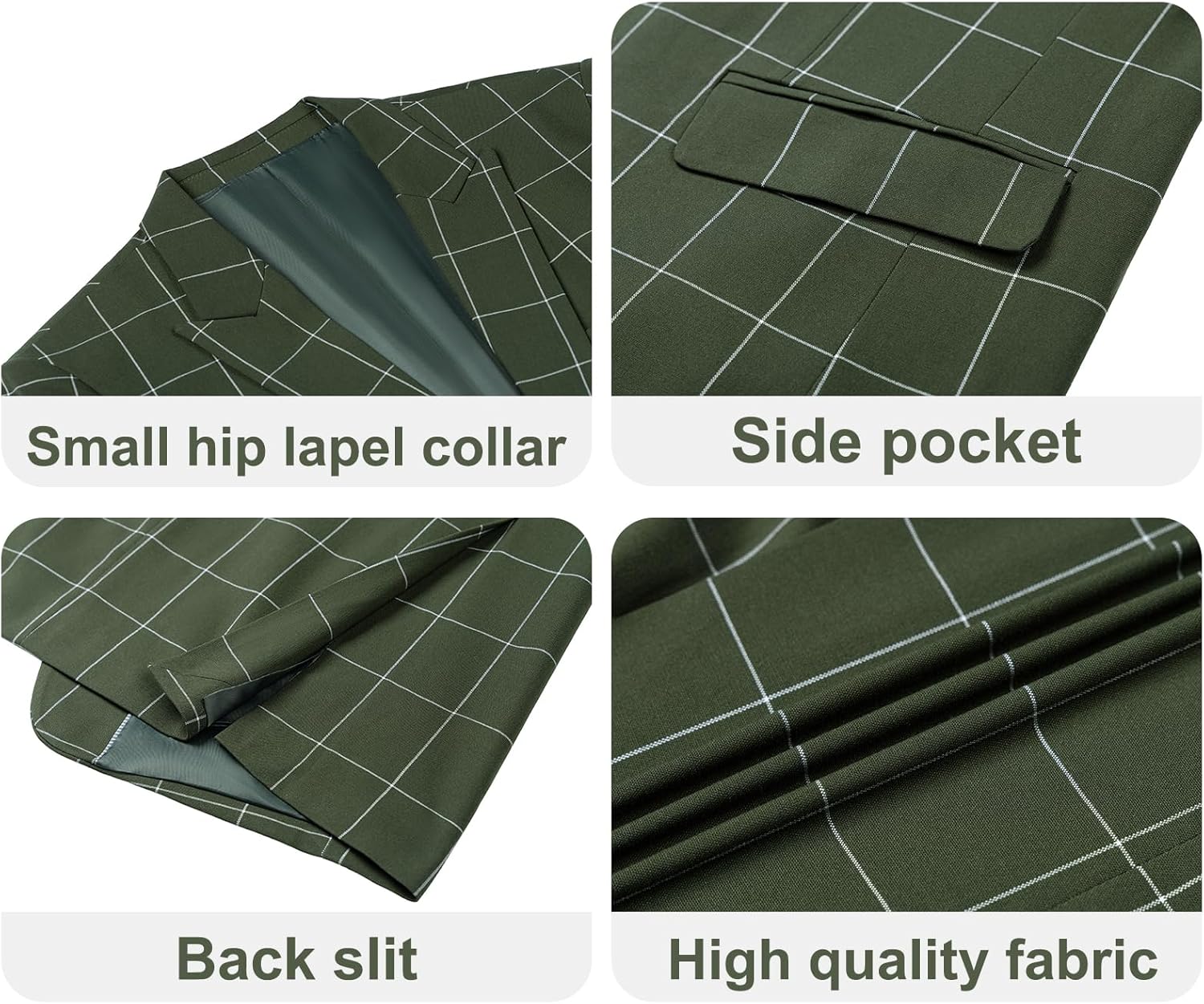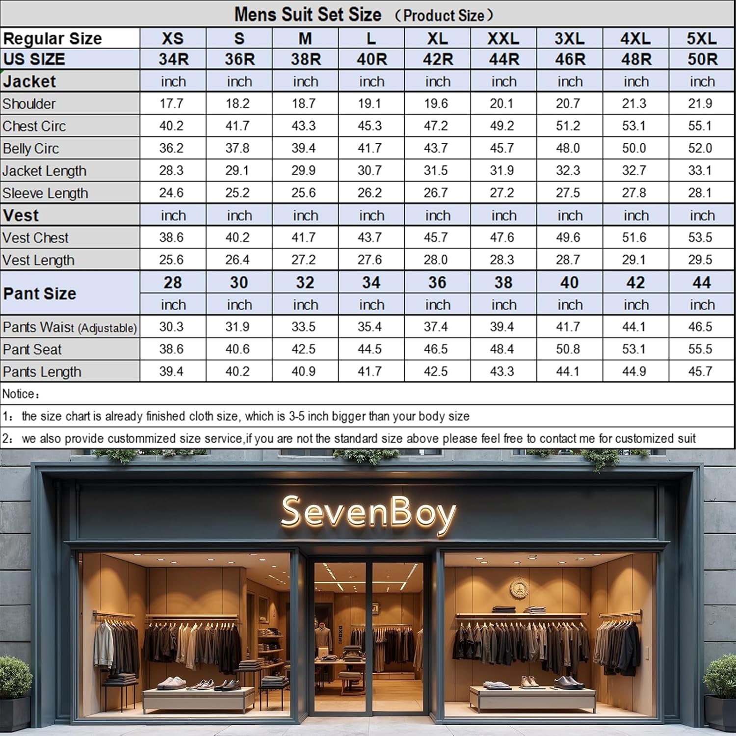 Size/XXL color green Explore our latest suit or tuxedo set! Match suit jacket with matching vest and pants for a slim-fitting three-piece suit; Available in sizes XS to 5XL in 4 colors; Pockets inside and outside feature authentic design with shiny chrome buttons; We have mastered style, comfort and affordability.