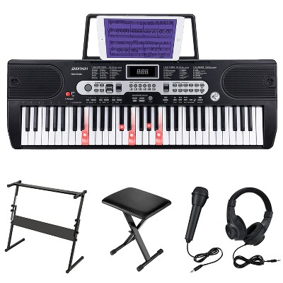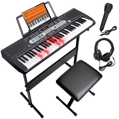 Elevate your musical journey with this versatile 61-key keyboard, ideal for both beginners and intermediate players. Featuring light-up keys and a responsive touch, this keyboard provides a dynamic and intuitive learning experience. Equipped with an array of accessories including a sturdy keyboard stand, comfortable padded bench, music stand, microphone, and high-quality headphones, this Super Kit is designed for comprehensive practice sessions. Enjoy the rich sound quality from dual stereo metal grilled speakers, offering 500 rhythms, 500 tones, and 65 demo songs to explore a broad spectrum of musical possibilities.