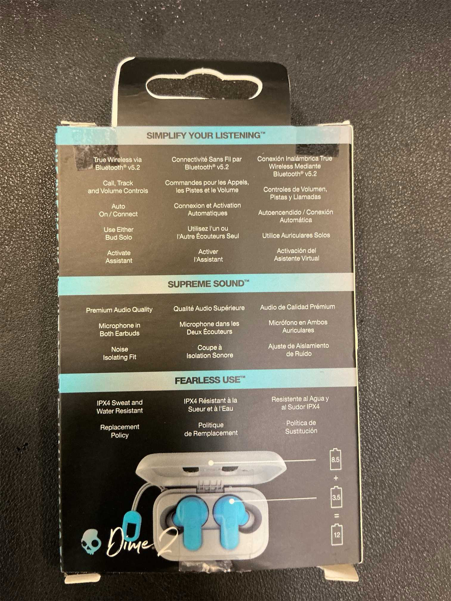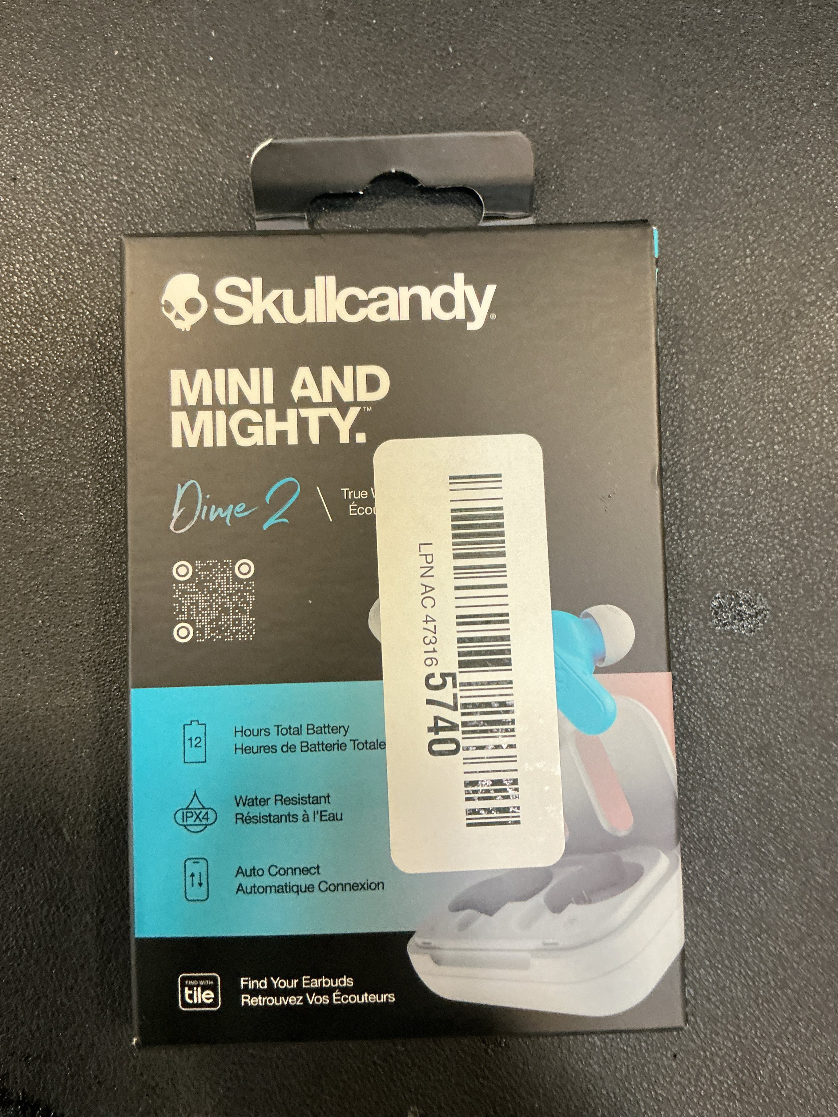 Skullcandy Dime 2 Wireless Earbuds, Bluetooth Headphones, Noise Isolating Fit, Up to 12 Hours Battery, Microphone for iPhone Android, Easy Carry with Integrated Lanyard - Light Grey/Blue