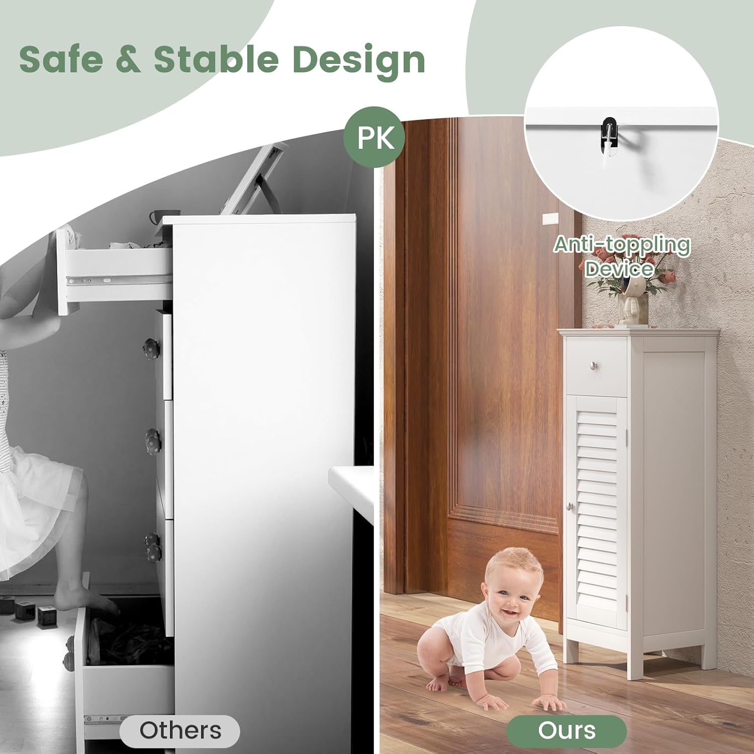Slim Bathroom Storage Cabinet, Wooden Floor Narrow Cabinet with Drawer & Shutter Door, Adjustable Shelf & Anti-toppling Fittings, Small Cabinet for Home Office, (White)