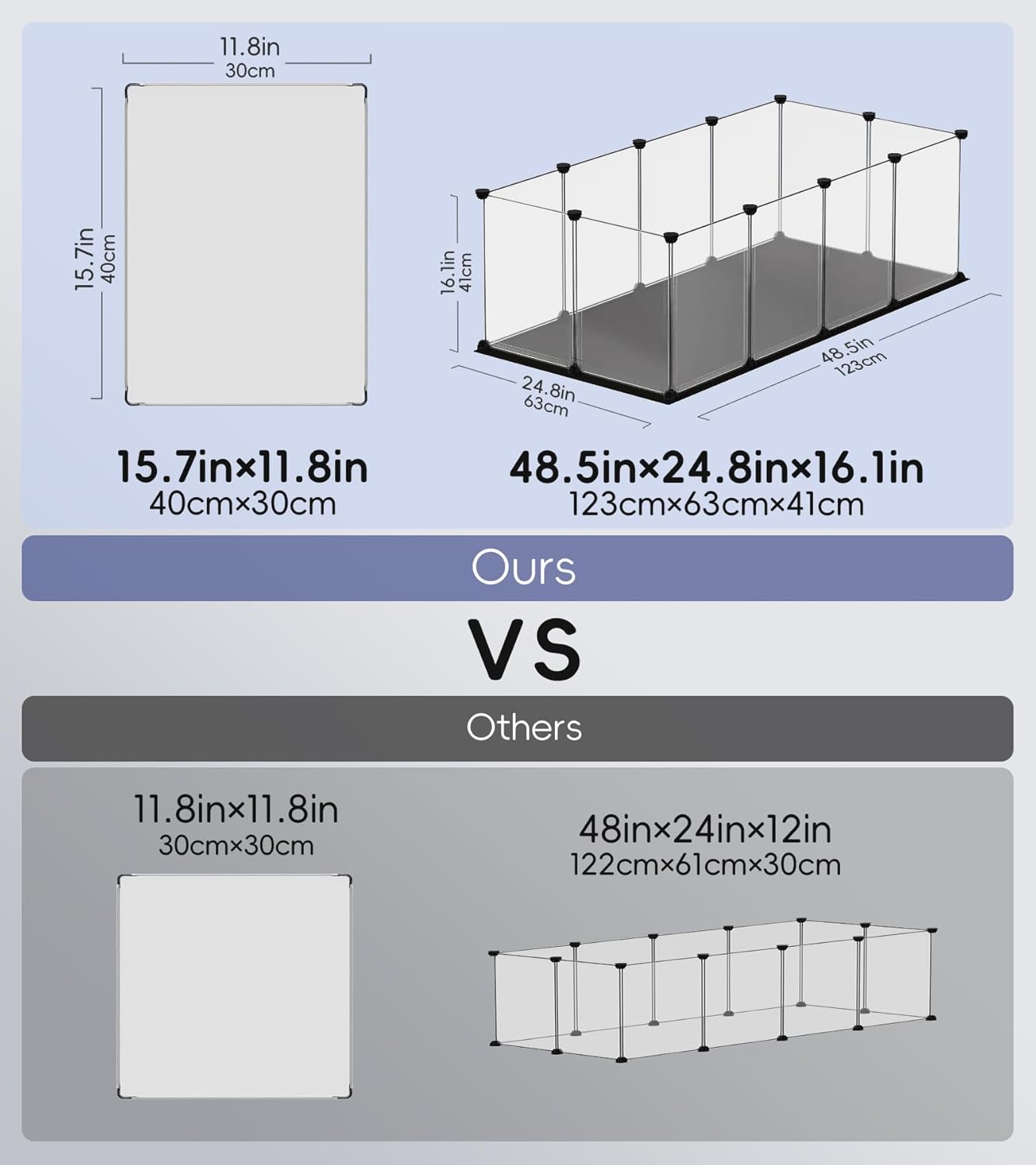 ???????????????????? ???????????????????????????????? ????????????????????????????????: This plastic pet fence is designed specifically for your small pets. Offering them a large, stable area to rest, exercise, and play. It's perfect for your guinea pigs, hedgehogs, and hamsters. The assembled dimensions are: 48.5 x 24.8 x 16.1 inches.
