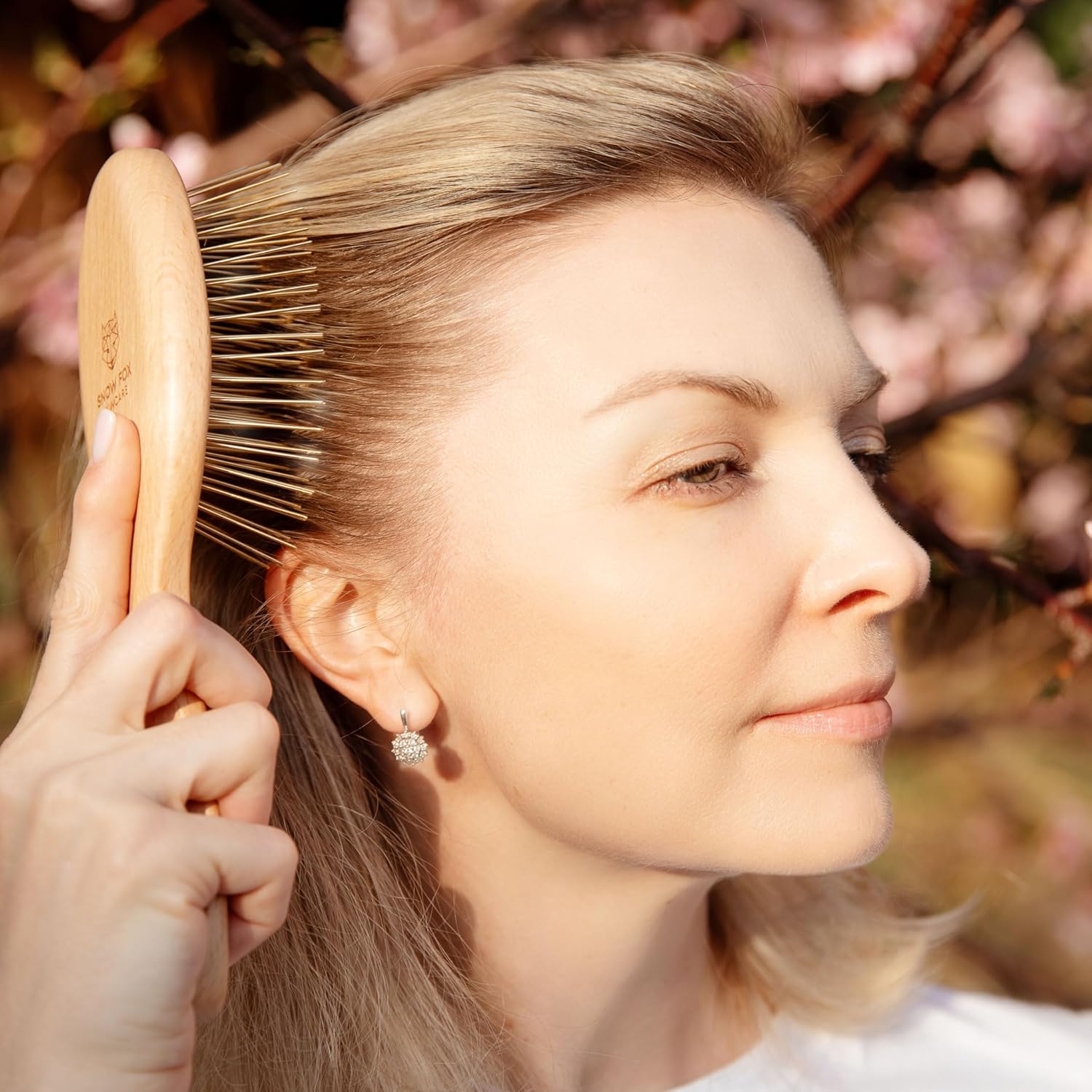 Snow Fox Skincare Gua Sha Hair Brush - Wooden Edition. Scalp Massage Comb with Gold-Plated Metal Bristles for Healthy Follicles. Soothing Gua Sha Acupressure Tool for All Hair Types